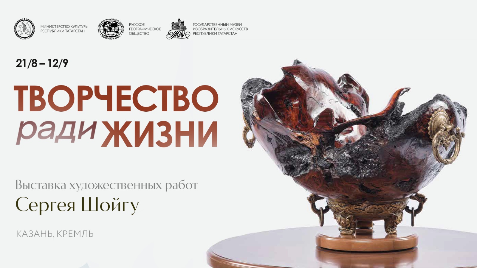 21 августа 2021 года впервые в Казани открывается выставка произведений Президента Русского географического общества Сергея Шойгу. Экспозиции называется «Творчество ради жизни». Она будет представлена публике в Казанском Кремле в Национальной художественной галерее «Хазине» ГМИИ РТ.