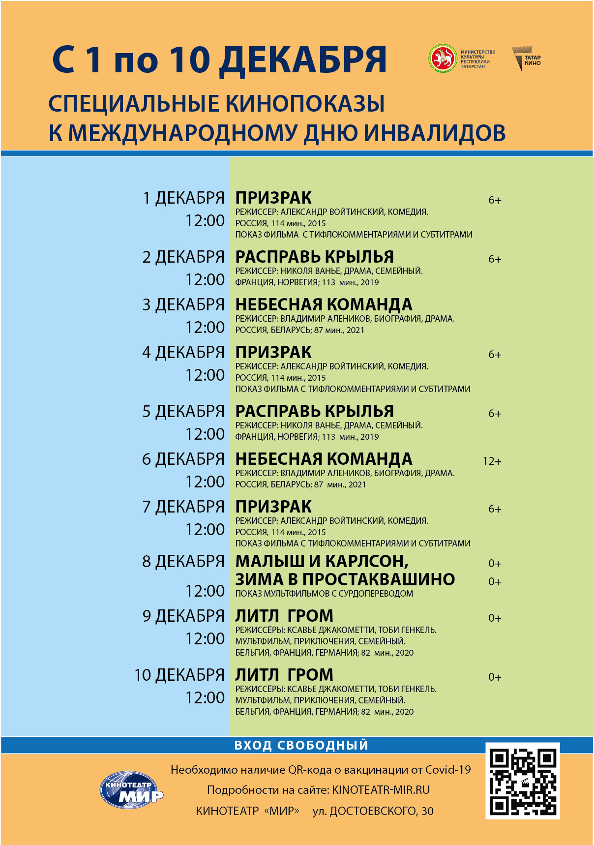 С 1 по 10 декабря в казанском кинотеатре «Мир» организуют цикл мероприятий, приуроченных к Международному дню инвалидов, отмечаемому 3 декабря. Кроме того, кинопоказы пройдут в «Экияте», а также районах республики.