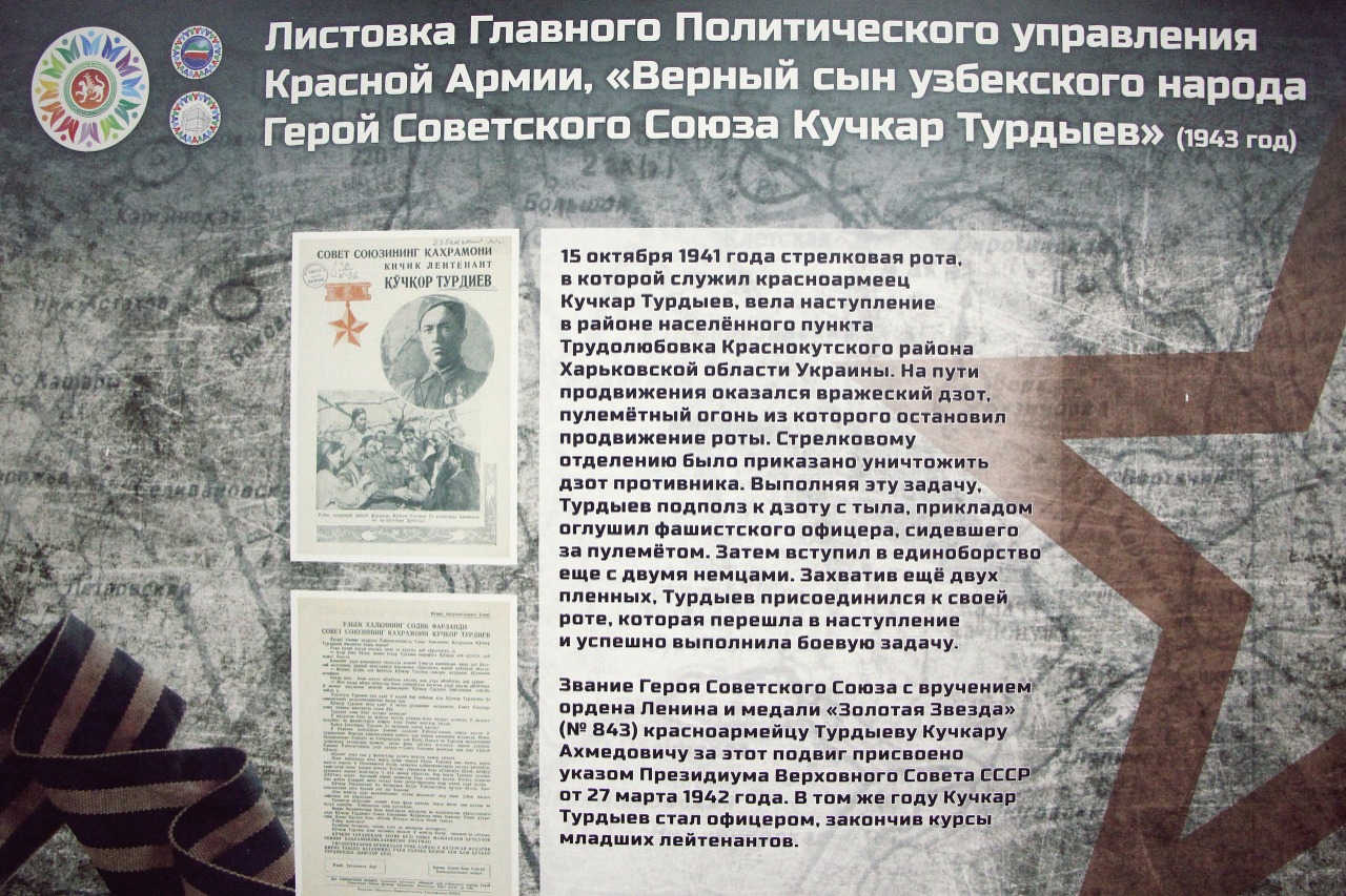 В листовках рассказывается краткая биография героя, его боевой подвиг и т.д. Среди этих героев — татарин Ильдар Маннанов, узбек Камал Пулатов, туркмен Айдагды Тахиров, грузин Чичико Бенделиани, казах Солтан Баймагамбетов, армянин Гукас Мадоян, азербайджанец Гафур Мамедов, киргиз Дуйшенкул Шопоков и многие другие. Всего будет представлено 16 образцов листовокна азербайджанском, армянском, башкирском, грузинском, казахском, кыргызском, татарском, русском и узбекском языках.