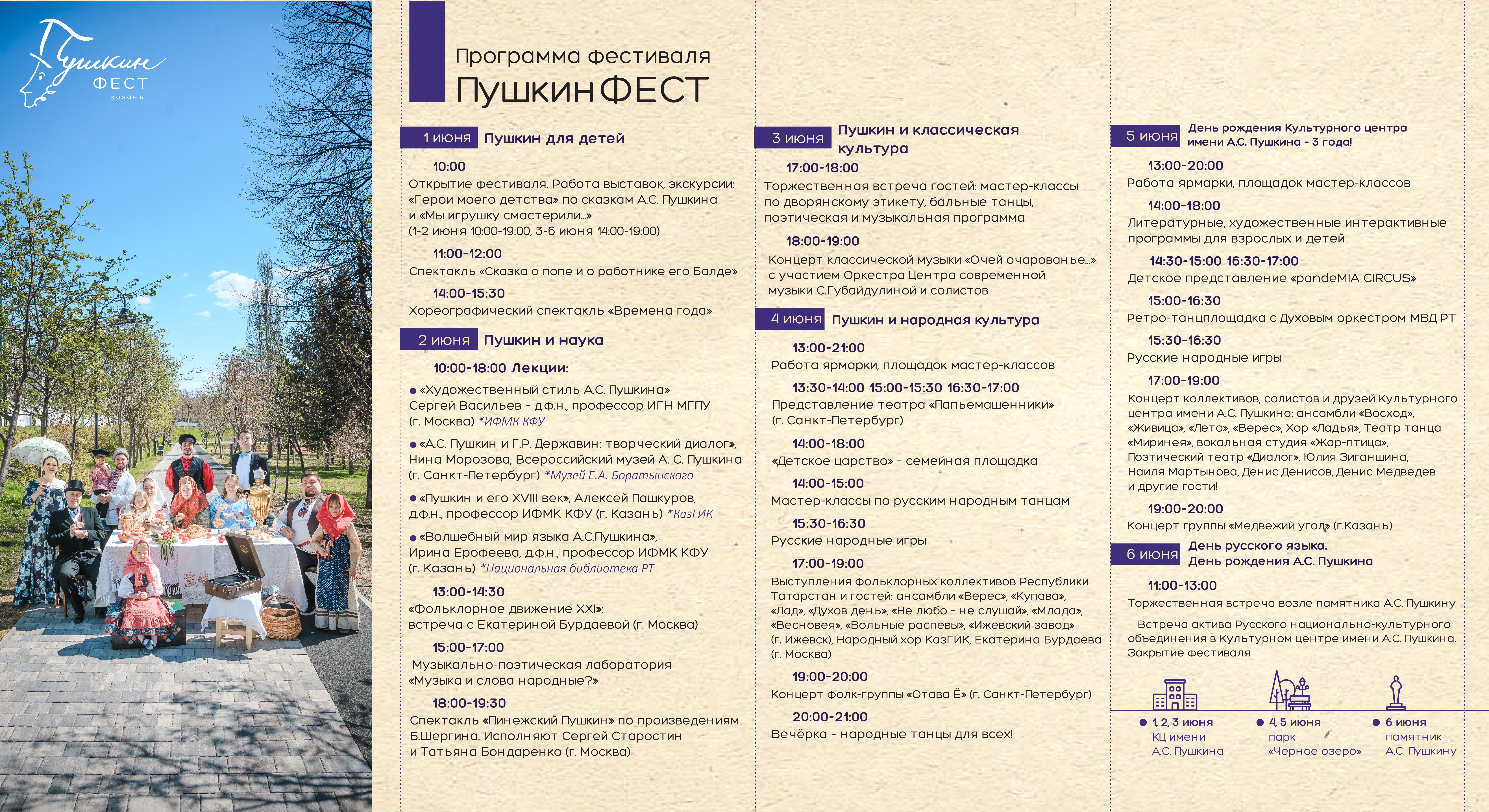 С 1 по 3 июня «ПушкинФЕСТ» соберёт зрителей на концерты, спектакли, выставки, литературные и художественные программы на площадках Культурного центра имени А.С. Пушкина. Гостей ждут бальные танцы, знакомство с дворянским этикетом, популярный лекторий, музыкально-поэтическая лаборатория.