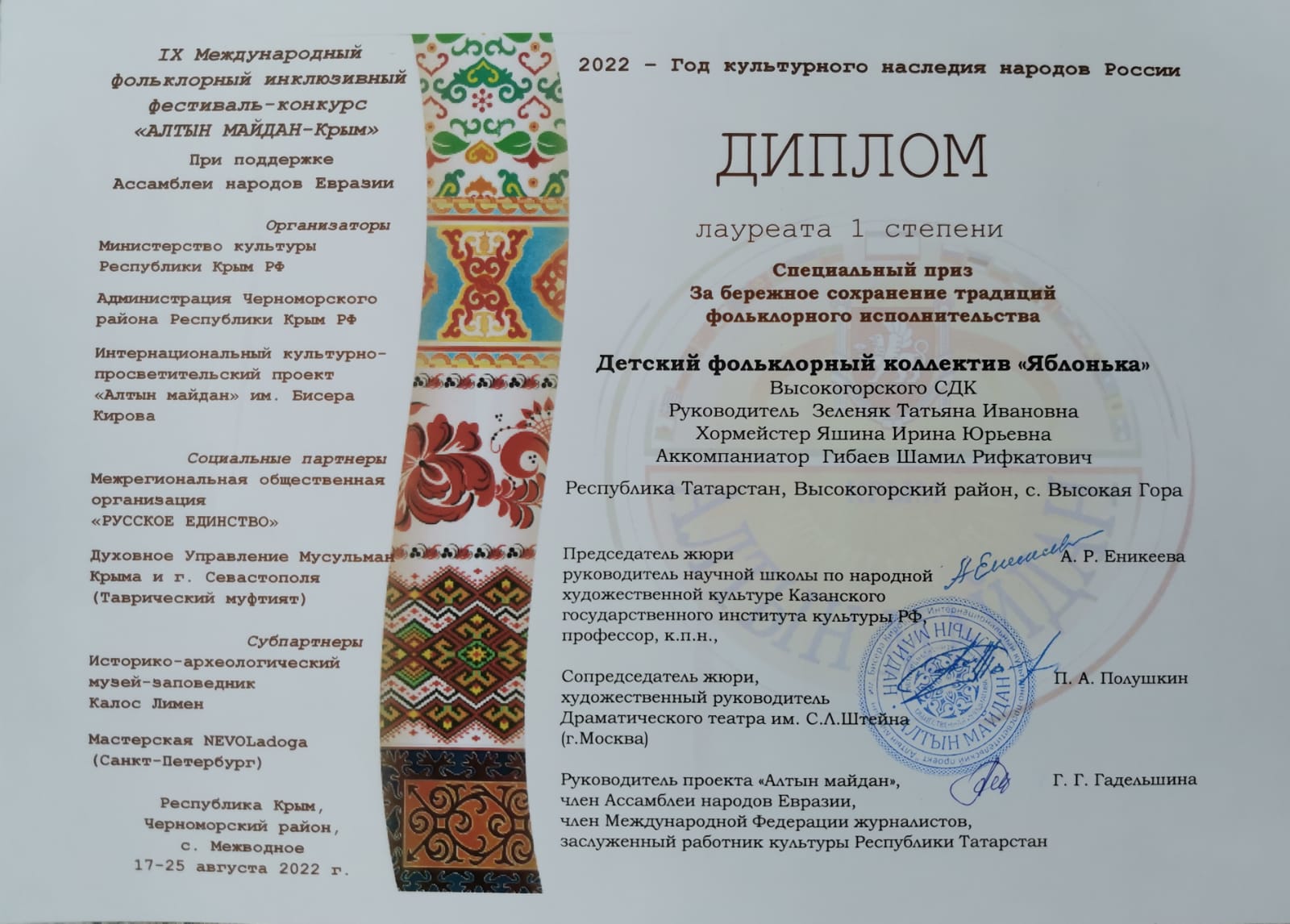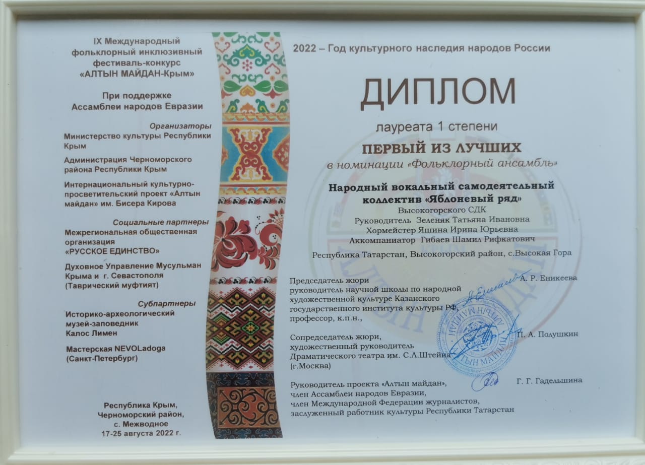 Народный вокальный самодеятельный коллектив «Яблоневый ряд» и детский фольклорный коллектив «Яблонька» Высокогорского сельского дома культуры (Республика Татарстан) завоевали звание Лауреатов I степени сразу в нескольких номинациях: «Фольклорный ансамбль», «Традиции народов мира. Этновечер», «Вокал. Народное (фольклорное пение). Ансамбль». Детский коллектив «Яблонька» награжден специальным призом «За бережное сохранение традиций фольклорного исполнительства». Солист ансамбля «Яблоневый ряд» Кирилл Агеев стал Лауреатом I степени в номинации «Вокал. Духовное песнопение. Соло» и Лауреатом II степени в номинации «Вокал. Народное (фольклорное пение). Соло». За активное участие в фестивале и взрослый и детский коллектив награждены Благодарственными письмами от Администрации Черноморского района.