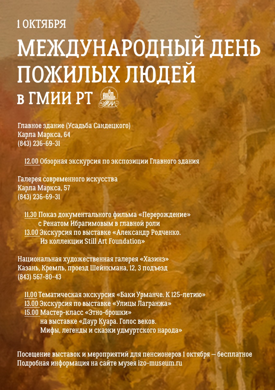 В Главном здании музея в 12:00 пройдет обзорная экскурсия, в Галерее современного искусства – показ документального фильма "Преображение", а в 13:30 — обзорная экскурсия по выставке фотографий Александра Родченко. В "Хазинэ" посетителям третьего возраста можно посетить тематические экскурсии по выставкам с 11:00 до 13:00, а в 15:00 — мастер-класс по этно-брошкам.