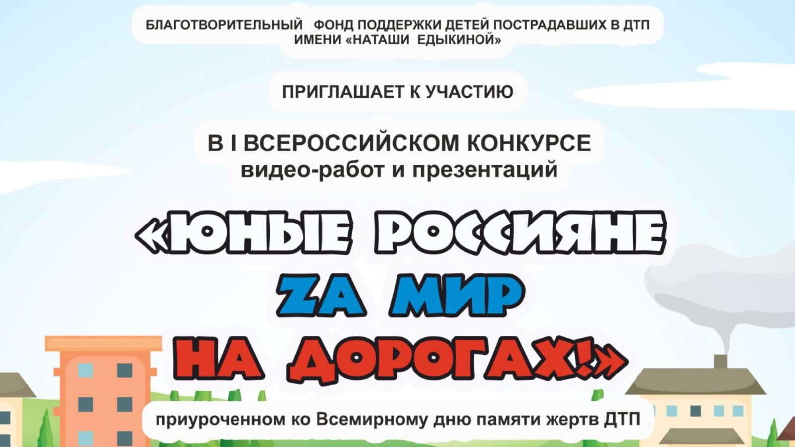 Благотворительный фонд поддержки детей пострадавших в ДТП имени «Наташи Едыкиной» проводит VI Всероссийский конкурс рисунков по ПДД «Новый дорожный знак глазами детей» проекта «Со светофоровой наукой по добрым дорогам детства» и I Всероссийский конкурс видео-работ и презентаций «ЮНЫЕ РОССИЯНЕ ZА МИР НА ДОРОГАХ!», приуроченные ко Всемирному дню памяти жертв ДТП.