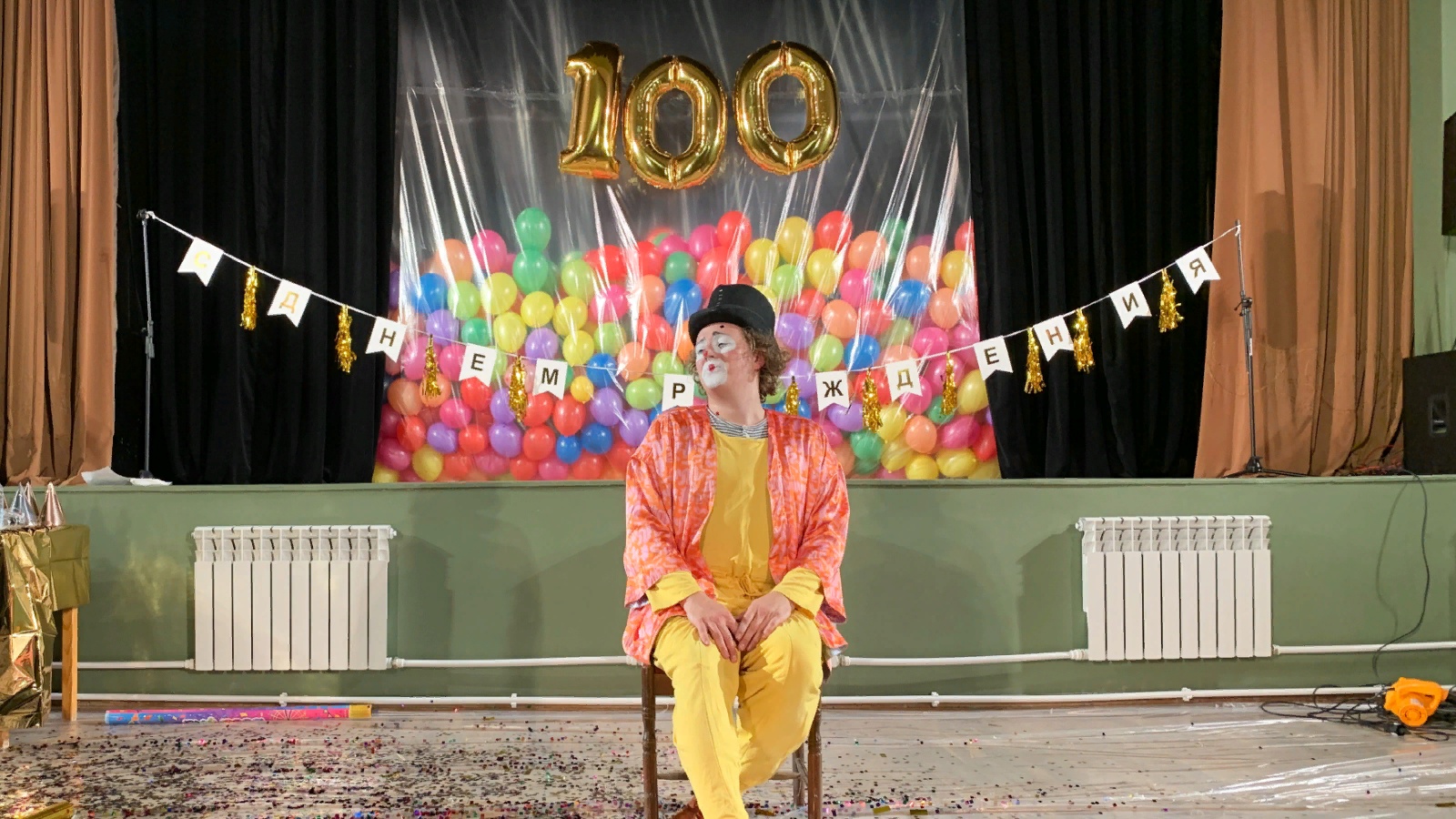 Руслан представил импровизацию в жанре клоунады в одном действии. Были все атрибуты праздника: конфетти, шары, колпачки, свистки, свечки и торт. Часовое представление сопровождалось танцами, играми и весельем, которое создавал Руслан.