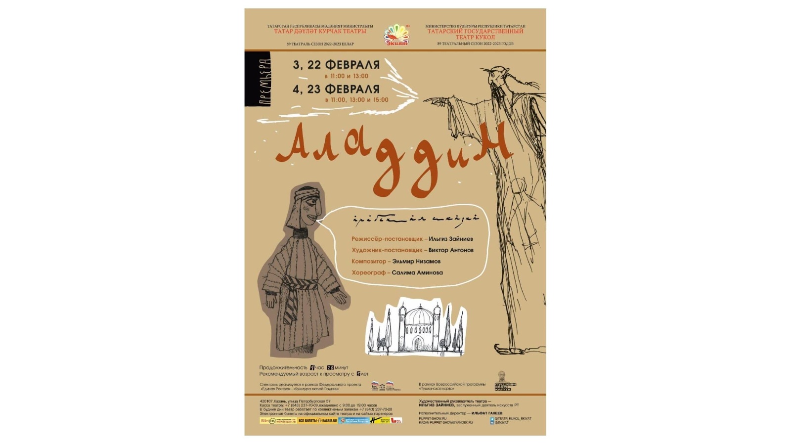 3 февраля театр кукол «Экият» представит первую премьеру этого года спектакль «Аладдин», по мотивам арабской сказки из сборника «Тысяча и одна ночь». Особенность данного спектакля в том, что над его созданием трудится мощная постановочная группа, создателями премьеры выступили мэтры искусства.