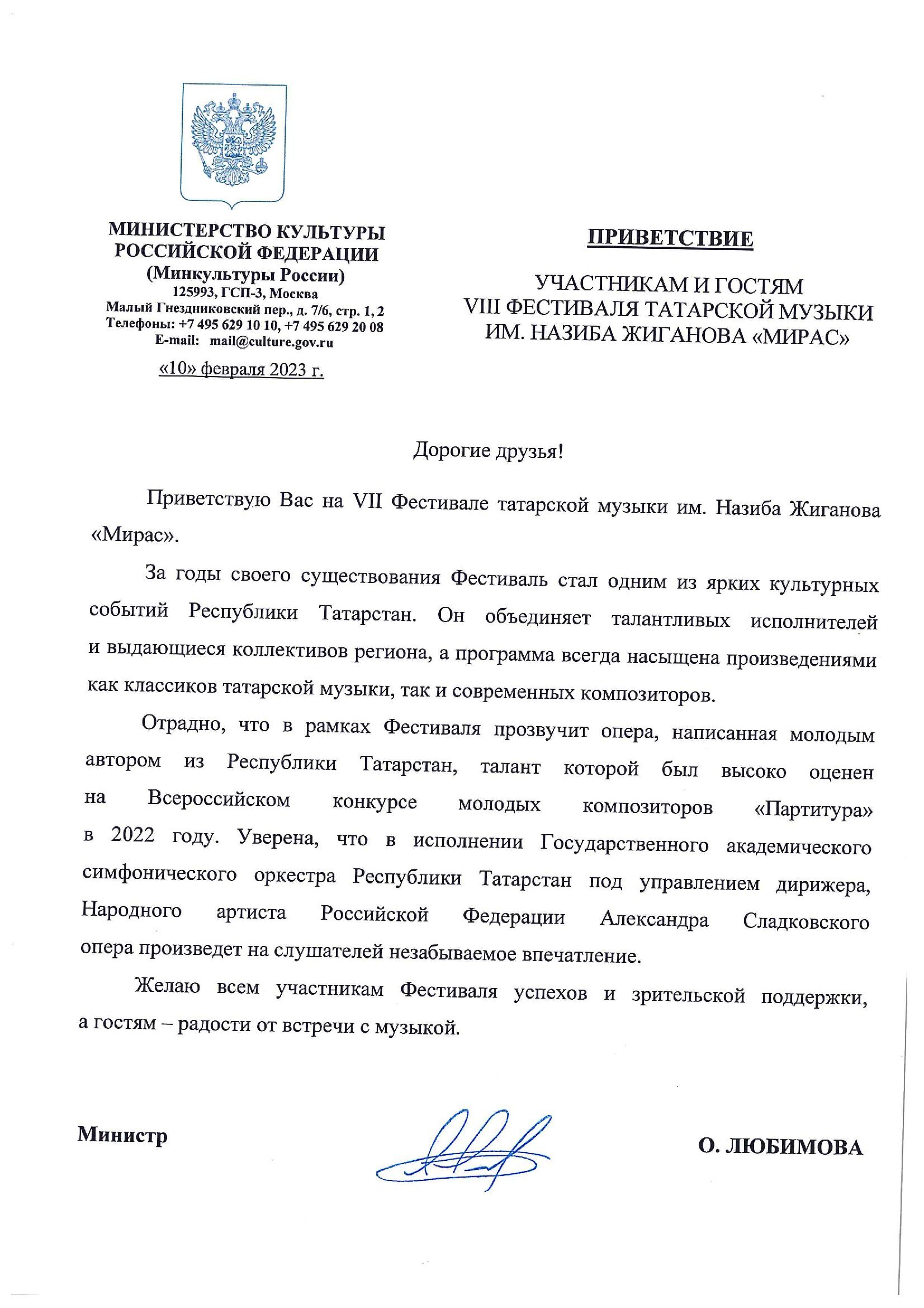 Приветственное слово участникам и гостям VIII фестиваля татарской музыки им. Назиба Жиганова «Мирас» выразила министр культуры РФ Ольга Любимова.
