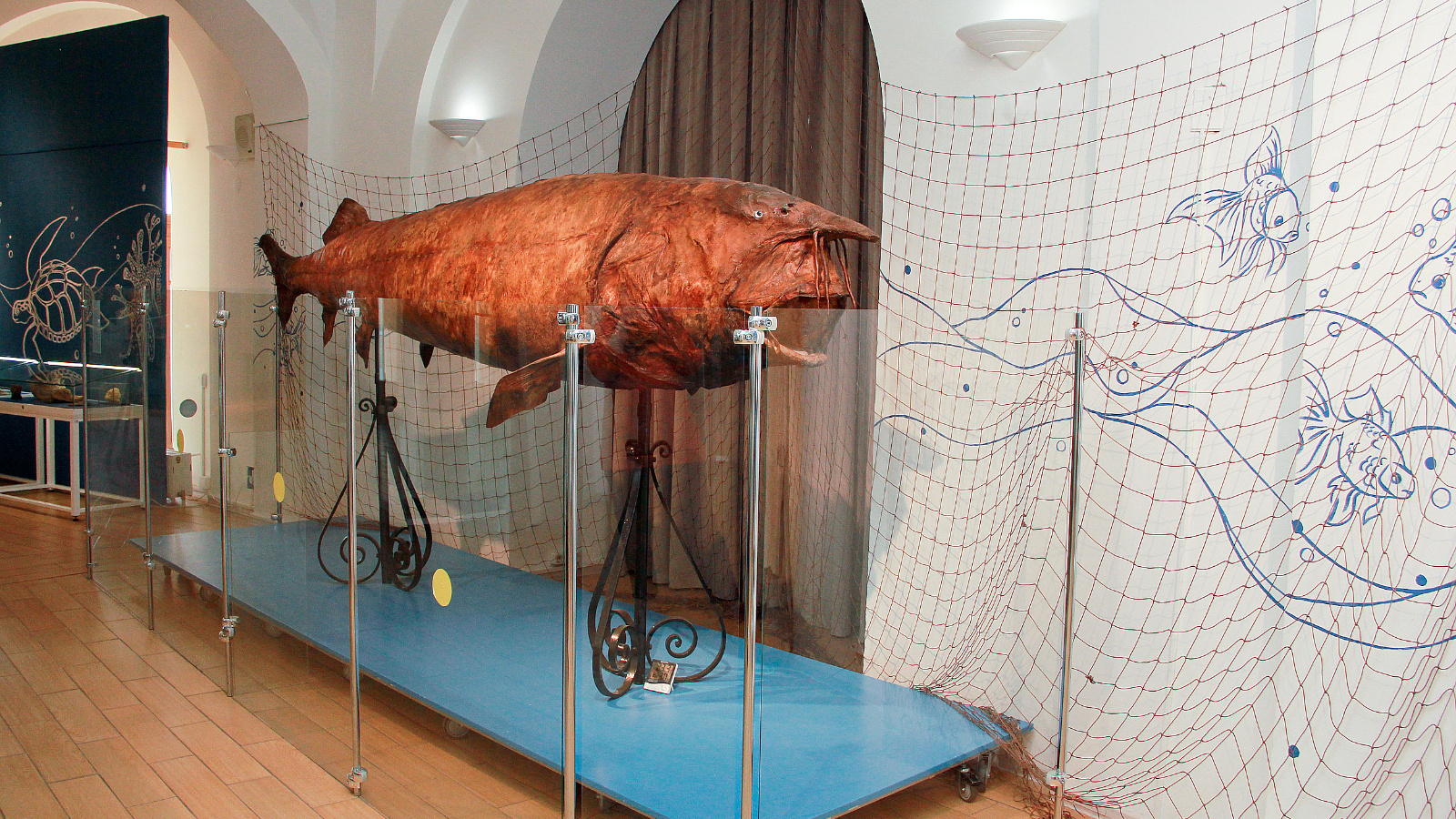 Чучело белуги – настоящее чудо природы длиной более 4 метров. Рыбу весом 960 кг выловили в Волге под Саратовом в 1895 году. Мясо съели, а шкуру засолили. В начале XX века в Зоологическом музее Санкт-Петербурга было изготовлено чучело этой гигантской рыбы, которое позднее подарили Казани по повелению императора Николая II.