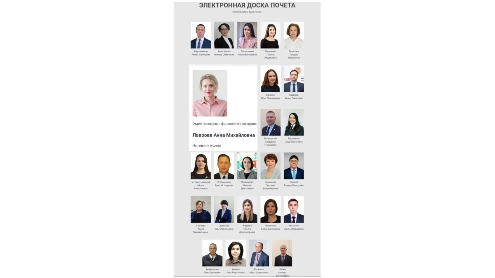 Электронная доска почета Республики Татарстан - это информационный раздел на официальном портале республики, где размещена информация о государственных гражданских служащих, которые признаны лучшими в профессиональной служебной деятельности и внесли личный вклад в повышение эффективности реализации полномочий государственных органов.