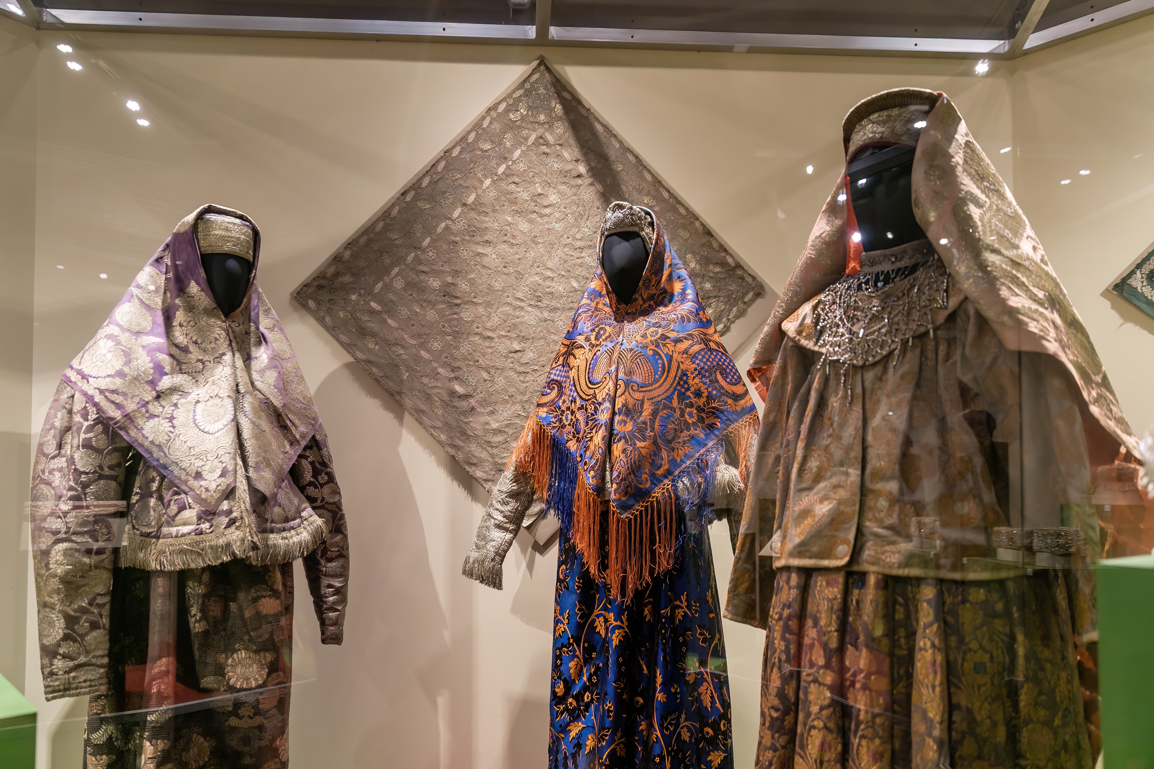 Можно увидеть московские кокошники – в виде шапочек, как у бояр, шитые золочёной нитью. Владимирские кокошники, похожие на месяц. Каргопольские кокошники из парчи, расшитые жемчугом. Новгородские кики, повойники Казанской губернии, парчовые платки. А также три сарафанных комплекса – нижегородский, владимирский и казанский.