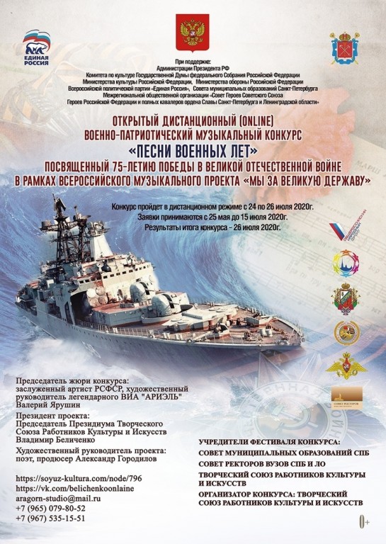 Приглашаем принять участие в грандиозном проекте, в открытом дистанционном (online) военно-патриотическом музыкальном конкурсе «Песни военных лет!», посвященного 75-летию Победы в Великой Отечественной Войне, в рамках Всероссийского музыкального проекта «Мы за Великую Державу». Участниками Конкурса могут стать любители и профессионалы вокального и поэтического искусства: театральных и литературных студий; почитатели литературы и художественного слова; жители Российской Федерации, а также жители стран ближнего и дальнего зарубежья; творческие коллективы и отдельные исполнители.