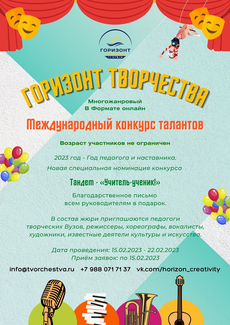 Начался приём заявок на участие в Международном конкурсе талантов «Горизонт Творчества» (многожанровый, в формате онлайн). Основная цель конкурса-поддержка талантливых людей в реализации их творческого потенциала. Для оценки конкурсных выступлений приглашается жюри, в состав которого входят педагоги творческих вузов, актёры, хореографы, вокалисты, художники, опытные преподаватели , деятели культуры и искусства.