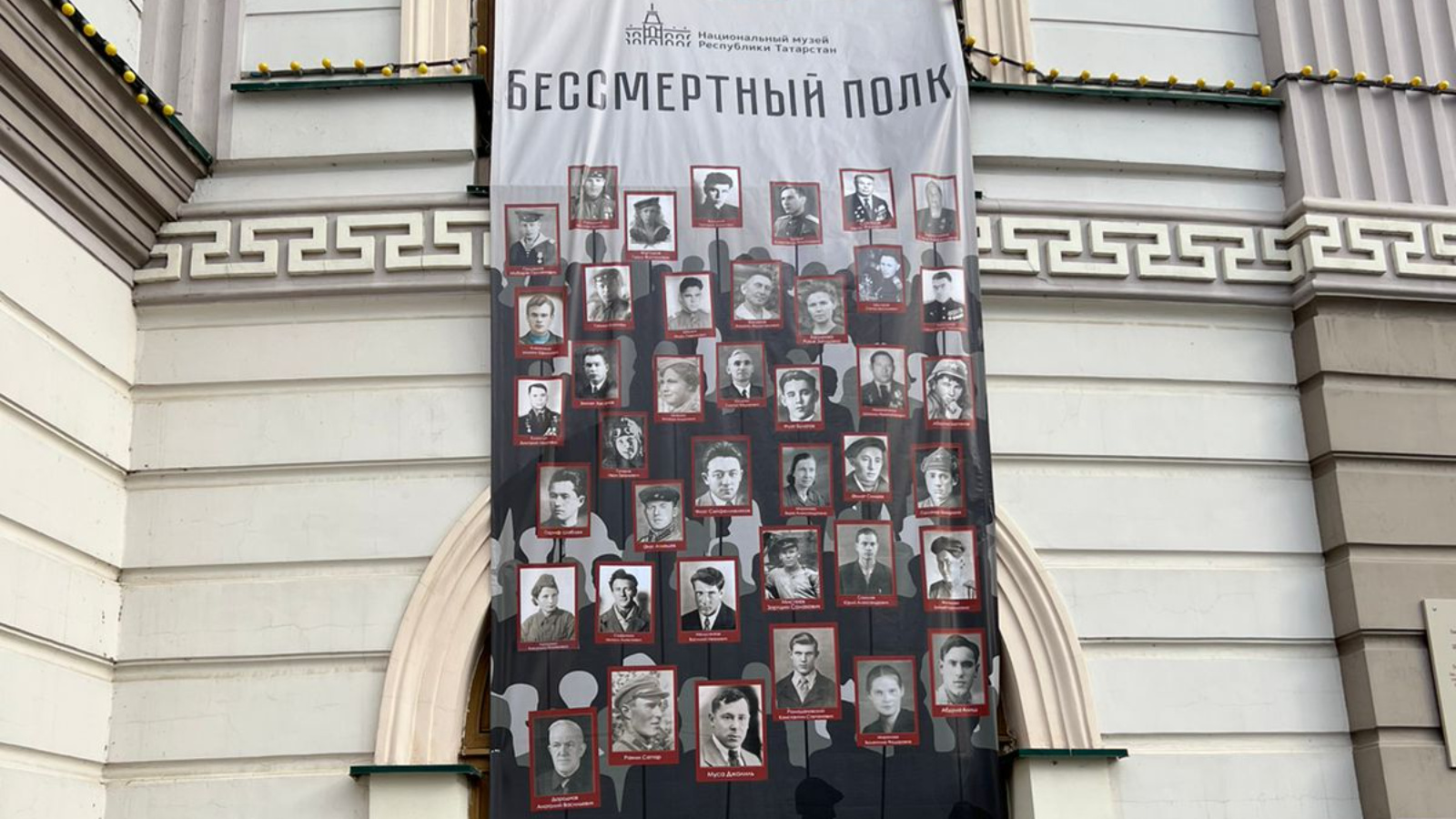 В канун праздника Победы на фасаде Национального музея РТ установили баннер с портретами героев, защищавших нашу Родину во время Великой Отечественной войны. Среди них фотографии работников музея - ветеранов и участников войны, писателей Татарстана и родственников музейных сотрудников. Таков вклад музея в акцию "Бессмертный полк" в новом формате.