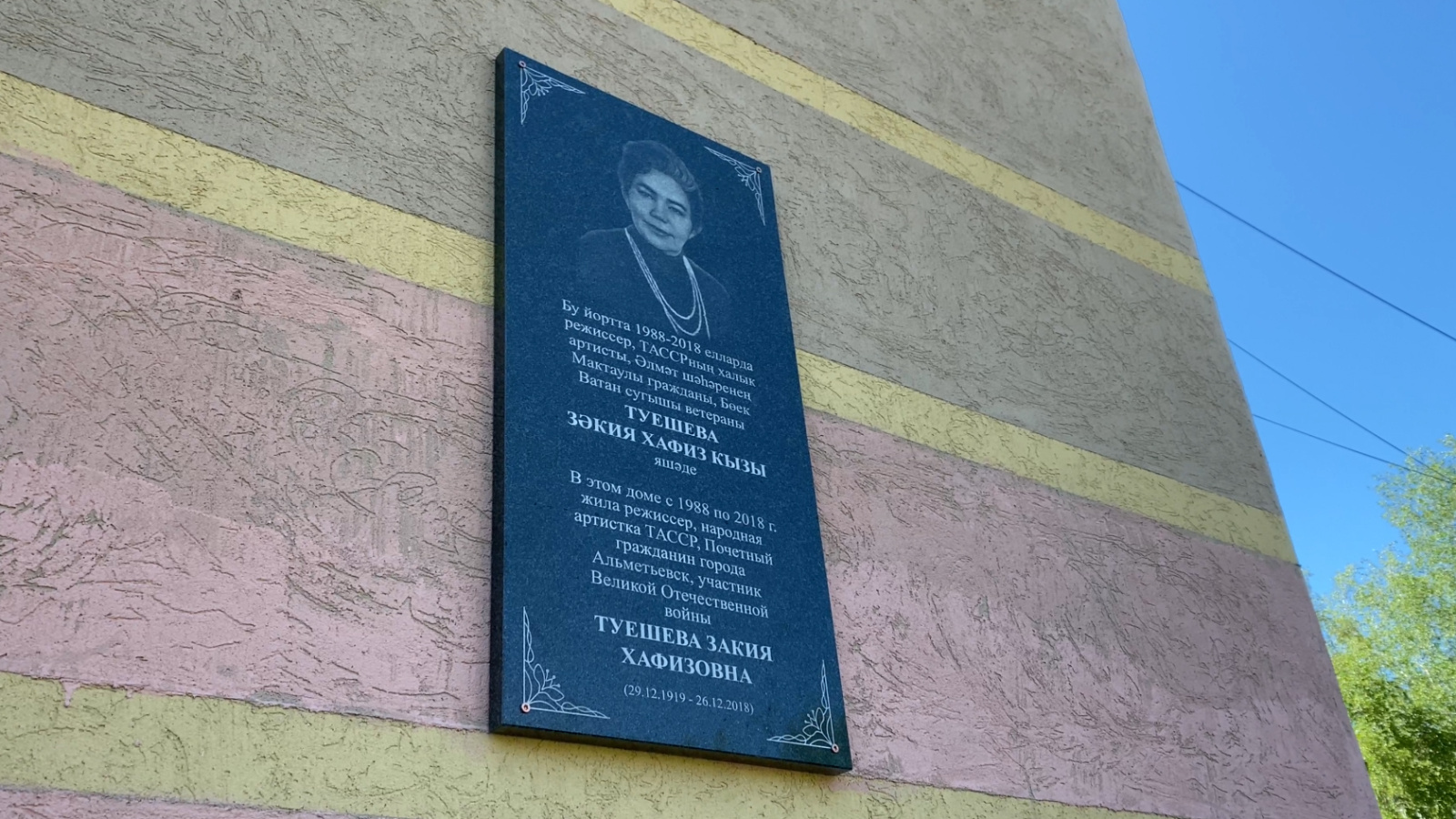 Сегодня в Альметьевске торжественно открыли мемориальную доску участнице Великой Отечественной войны, актрисе и режиссеру Альметьевского театра, народной артистке ТАССР Закие Хафизовне Туешевой.