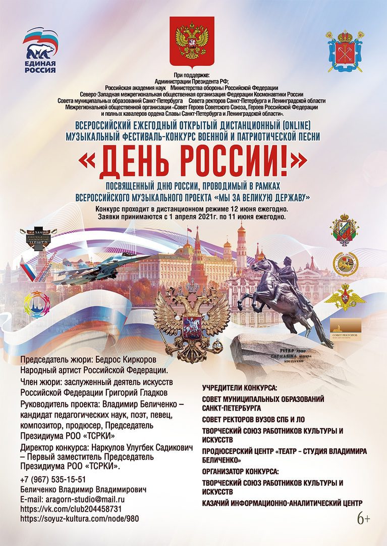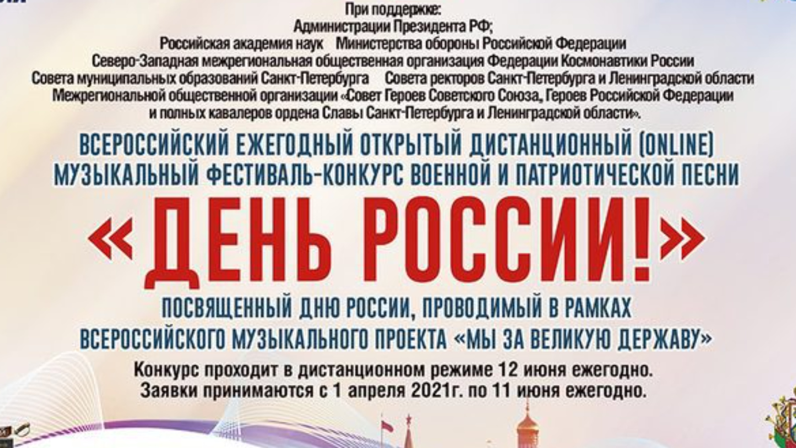 Третий Всероссийский ежегодный открытый дистанционный (online), музыкальный фестиваль-конкурс военной и патриотической песни «День России!» посвященный Дню России, проводимый в рамках Всероссийского музыкального проекта «Мы за Великую Державу» принимает заявки на участие!