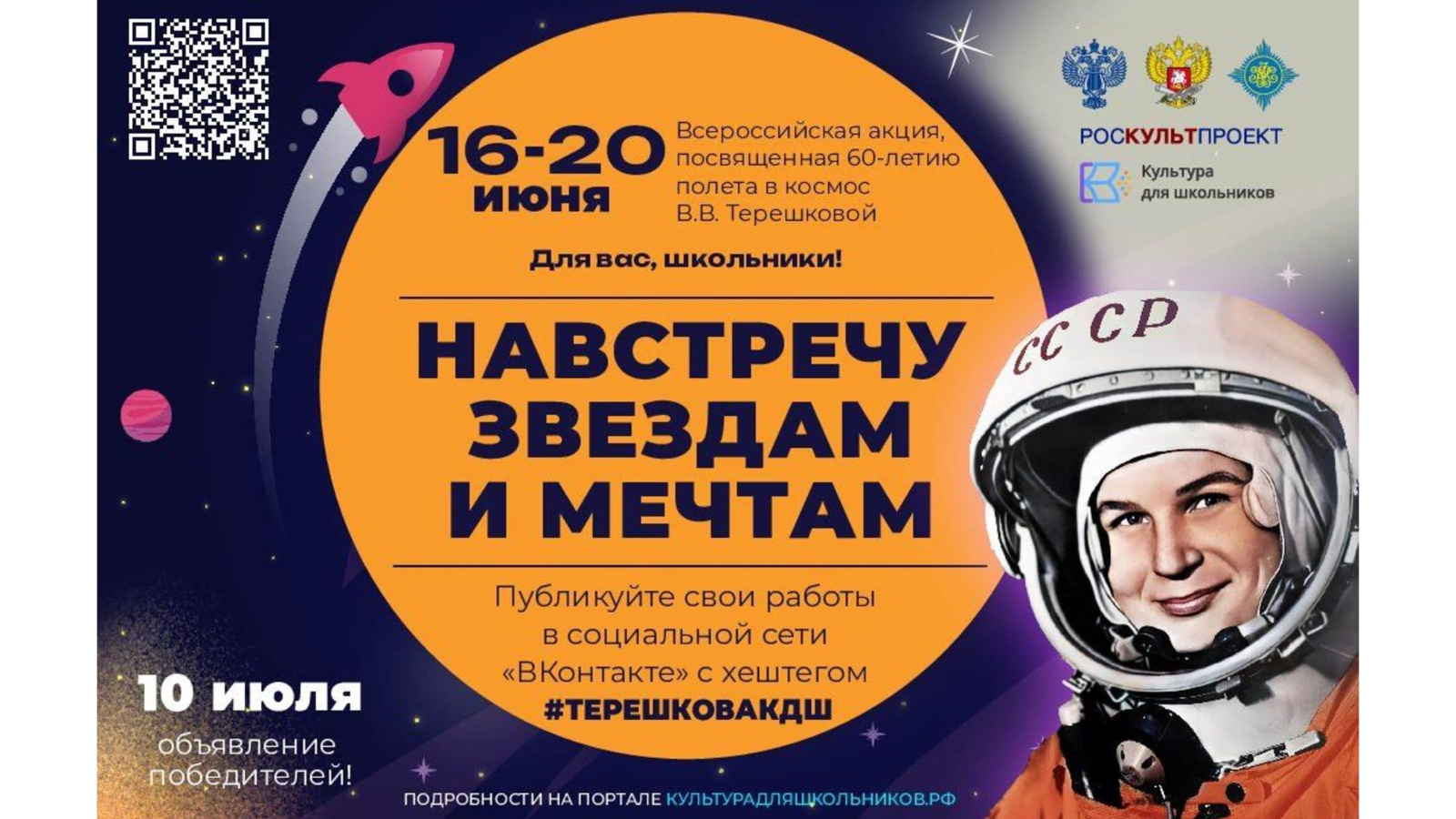 16 июня 2023 года в рамках проекта «Культура для школьников» стартует масштабная Всероссийская акция «Навстречу звездам и мечтам», посвященная 60-летию полета первой в мире женщины-космонавта Валентины Терешковой.