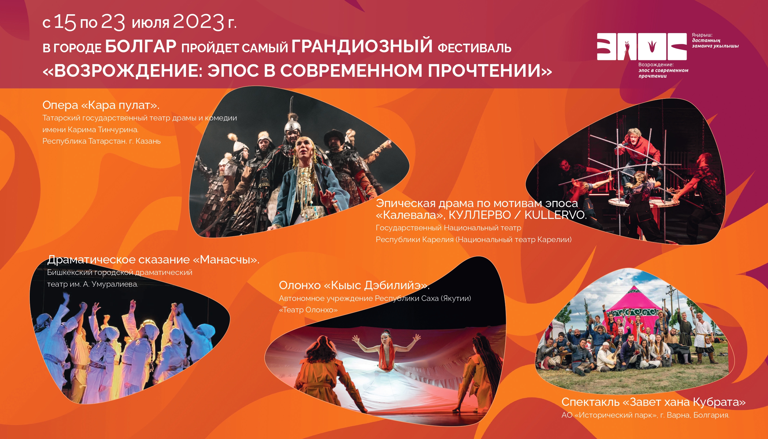 В рамках фестиваля зрители познакомятся и увидят Эпосы из Якутии (Олонхо), Карелии (Кулерво), Киргизии (Монасчы), Болгарии (Кубрат хан).
