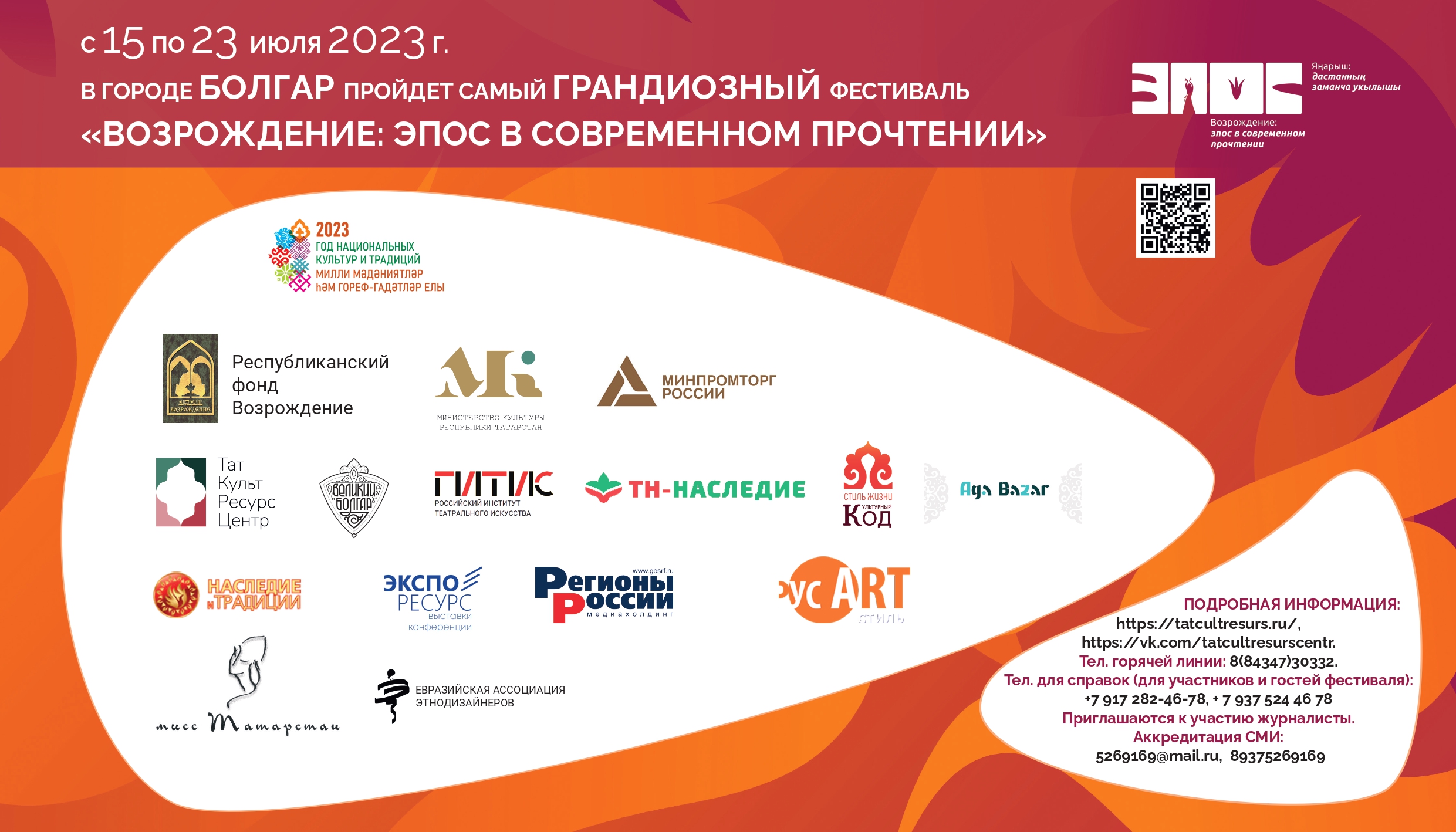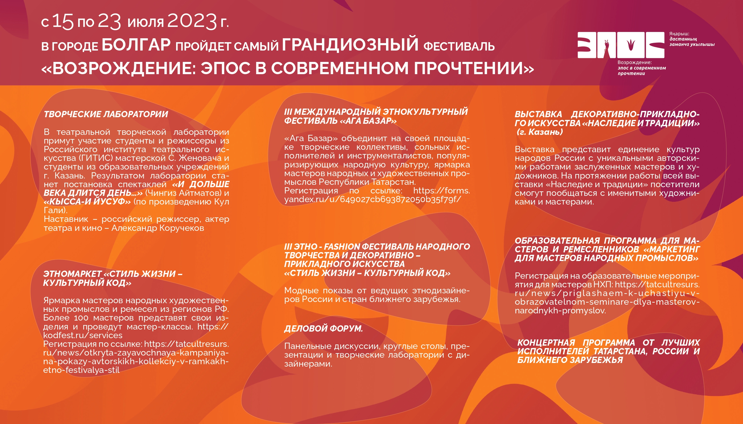 С 15 по 23 июля 2023 г. в городе Болгар пройдет большой недельный фестиваль «Возрождение: Эпос в современном прочтении». Спектакли по мотивам эпосов народов мира, показы мод этно-дизайнеров, большая концертная программа и шоу-концерт от исполнителей фолк-фьюжн направления, творческие лаборатории и возможность окунуться в средневековую атмосферу ярмарки ждет всех гостей фестиваля.