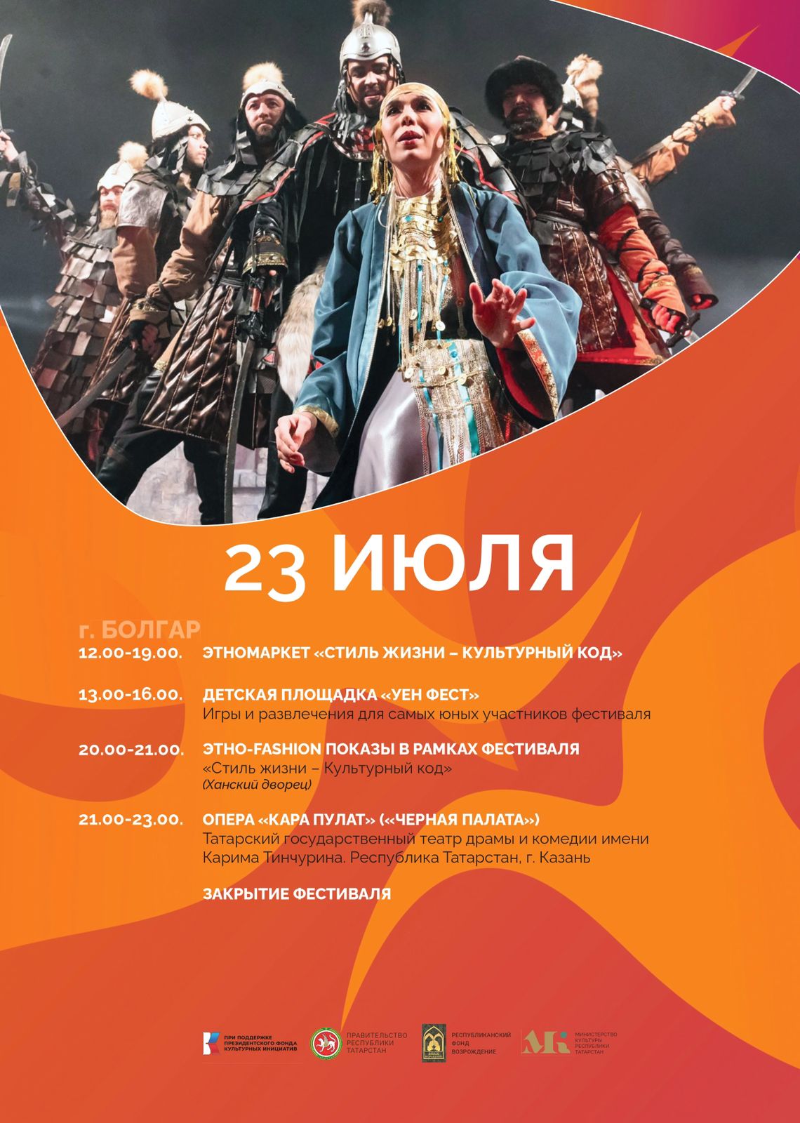 С 15 по 23 июля 2023 г. в городе Болгар проходит большой недельный фестиваль «Возрождение: Эпос в современном прочтении». Спектакли по мотивам эпосов народов мира, показы мод этно-дизайнеров, большая концертная программа и шоу-концерт от исполнителей фолк-фьюжн направления, творческие лаборатории и возможность окунуться в средневековую атмосферу ярмарки ждет всех гостей фестиваля.