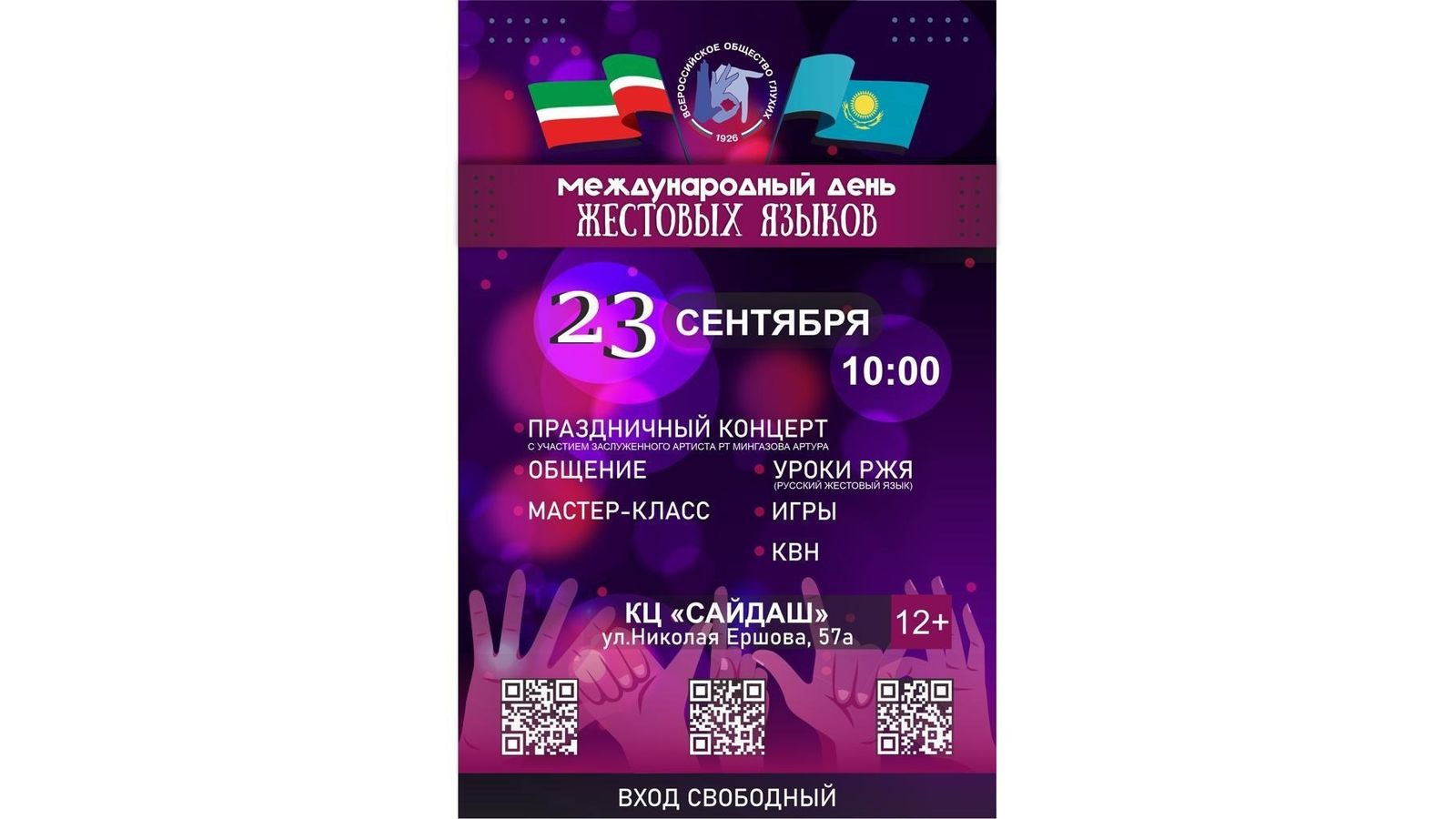 23 сентября в Культурном центре "Сайдаш" г.Казань состоится торжественное культурное мероприятие приуроченное к Международному дню жестовых языков.