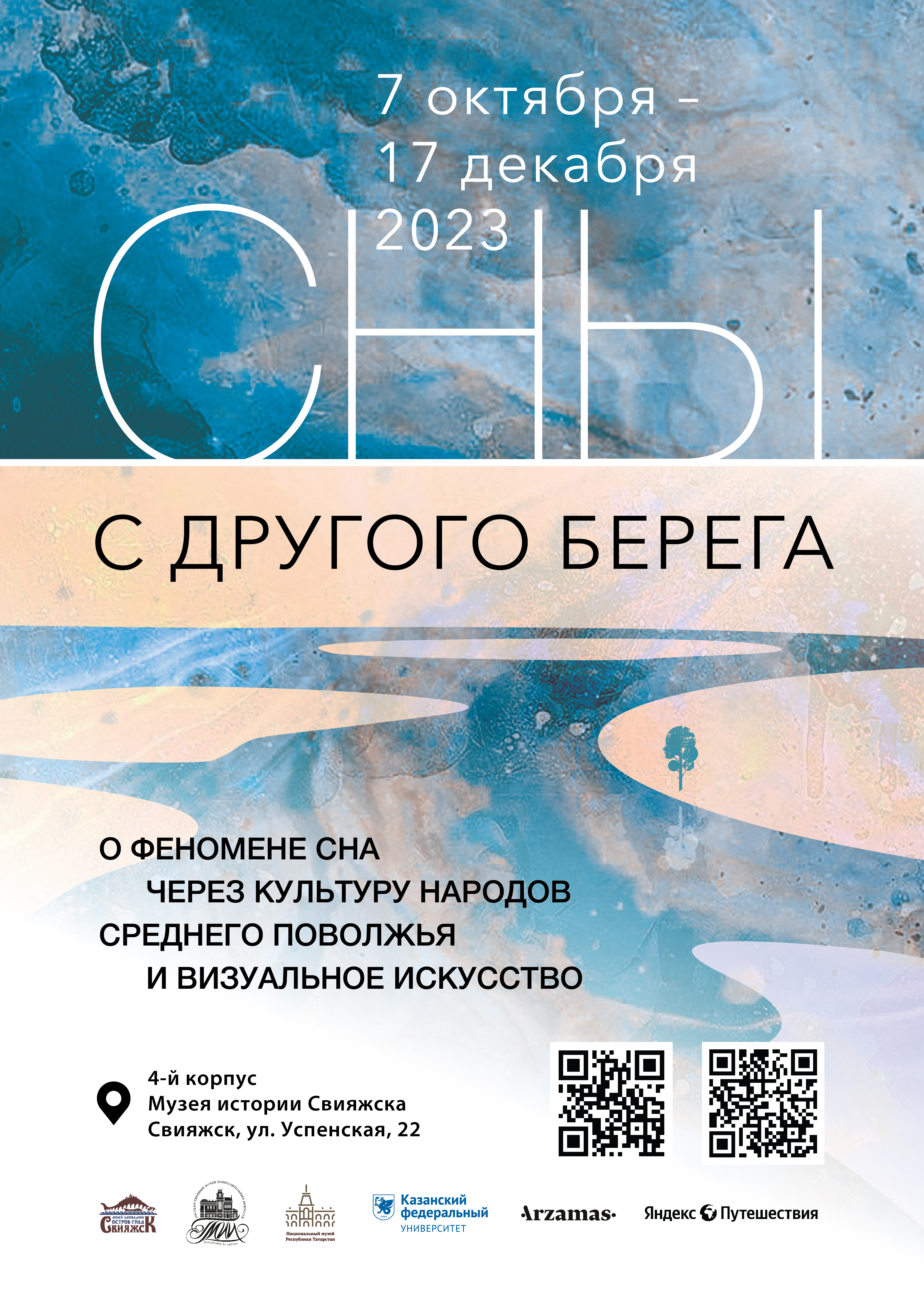 7 октября в Музее истории Свияжска откроется выставка «Сны с другого берега», представляющая многогранность феномена сна в культуре народов Среднего Поволжья, а также его интерпретацию в изобразительном искусстве. На этой выставке кураторы попробовали совместить в едином пространстве материальное и нематериальное культурное наследие феномена сна народов Среднего Поволжья: предметы быта, которые использовались в процессе сна и связанные с ним обычаи. Мифологические представления народов о сновидениях на выставке переплетаются с изобразительным искусством и философией: зрители узнают, как одно возникало из другого. Книжные издания покажут значимые вехи исследования сновидений в науке.