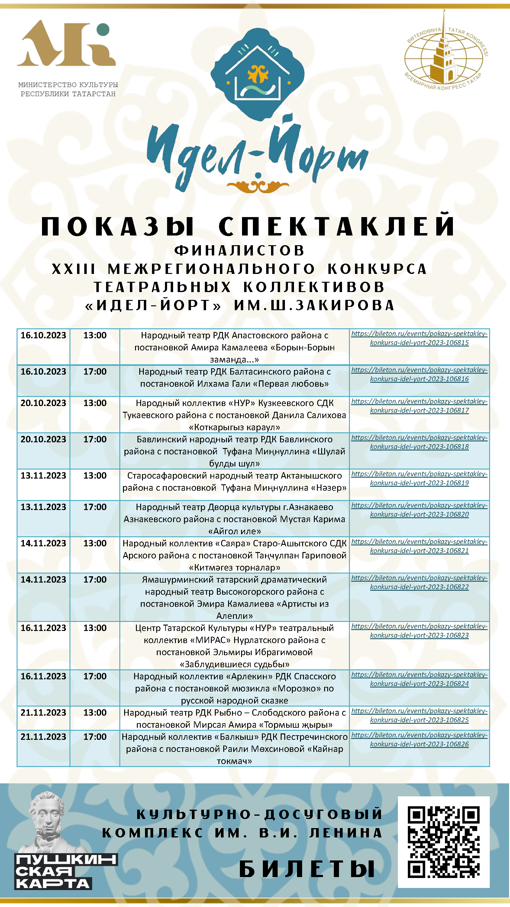 С 16 октября по 21 ноября в КДК им. Ленина пройдут показы 12 лучших спектаклей финалистов ХХIII Межрегионального конкурса театральных коллективов «Идел-йорт – 2023». По итогам просмотров будут определены 6 победителей – Лауреаты и Гран-при конкурса.
