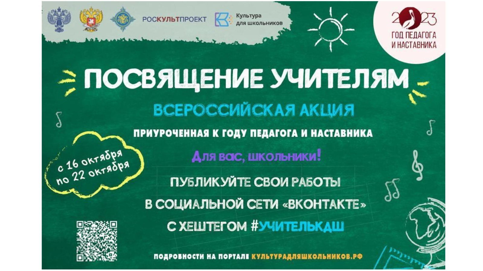 С 16 по 22 октября 2023 г. в рамках межведомственного культурнообразовательного проекта «Культура для школьников» пройдет Всероссийская акция «Посвящение учителям», приуроченная к Году педагога и наставника.