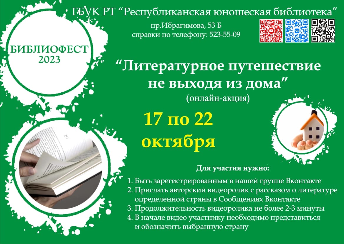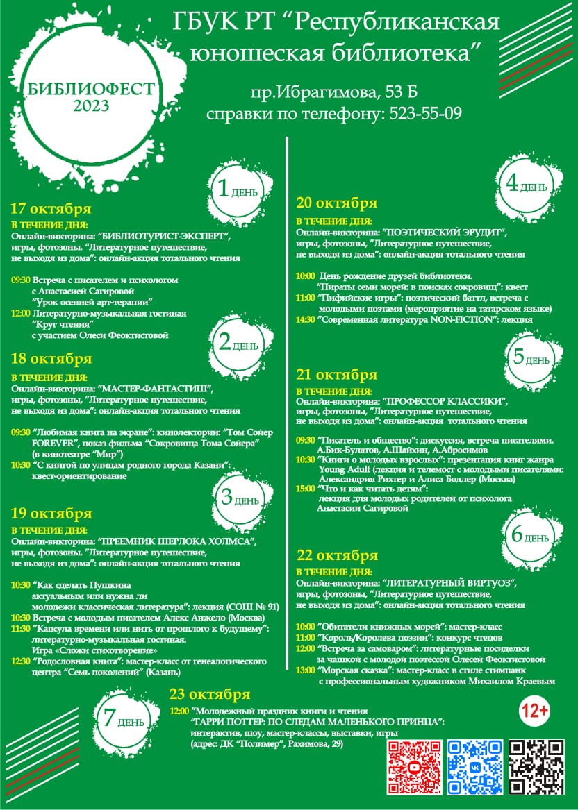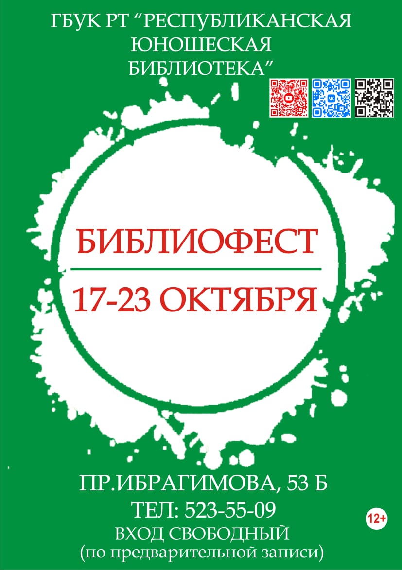 С 17 по 23 октября в Республиканской юношеской библиотеке (пр.Ибрагимова, д. 53Б) состоится «Библиофест: молодежный библиотечный фестиваль чтения».