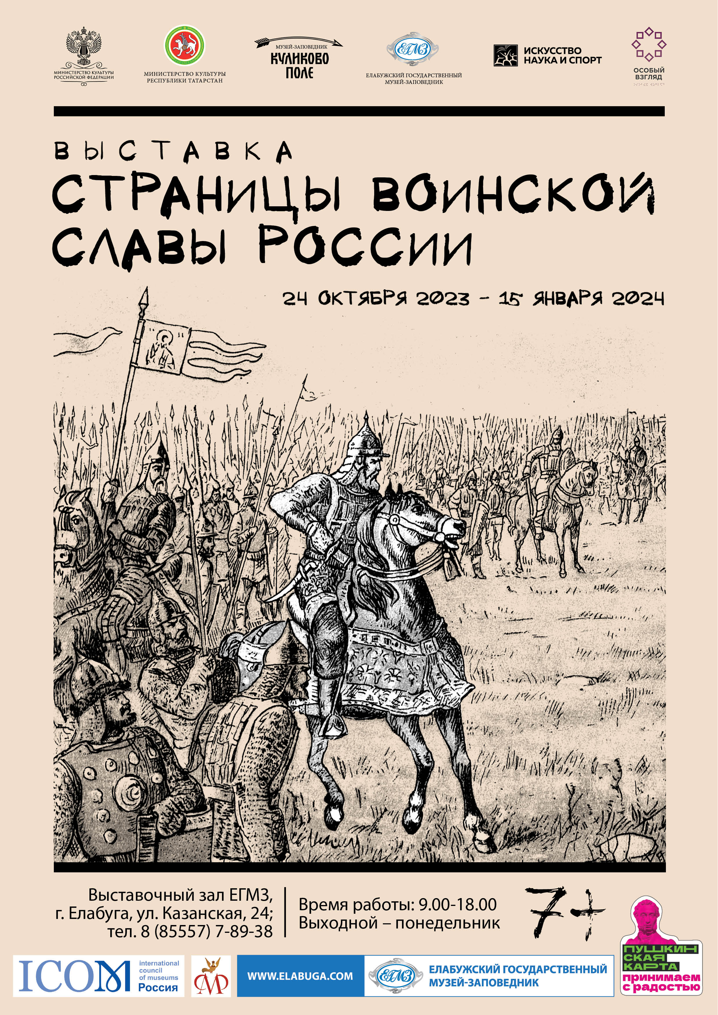 24 октября в 15 часов в Выставочном зале Елабужского государственного музея-заповедника состоится открытие выставки «Страницы воинской славы России» из собрания Государственного военно-исторического и природного музея-заповедника «Куликово поле» (г. Тула).