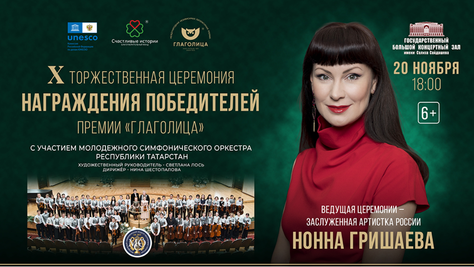 20 ноября в 18:00 часов в Большом концертном зале им. С.Сайдашева состоится Торжественная церемония награждения победителей 10-й юбилейной Международной независимой литературной Премии «Глаголица» и концерт Молодёжного симфонического оркестра Республики Татарстан.