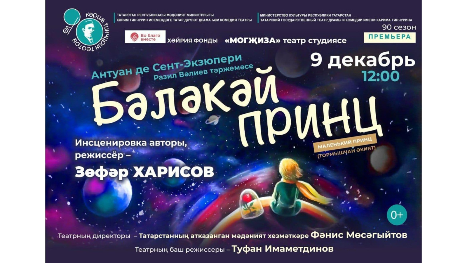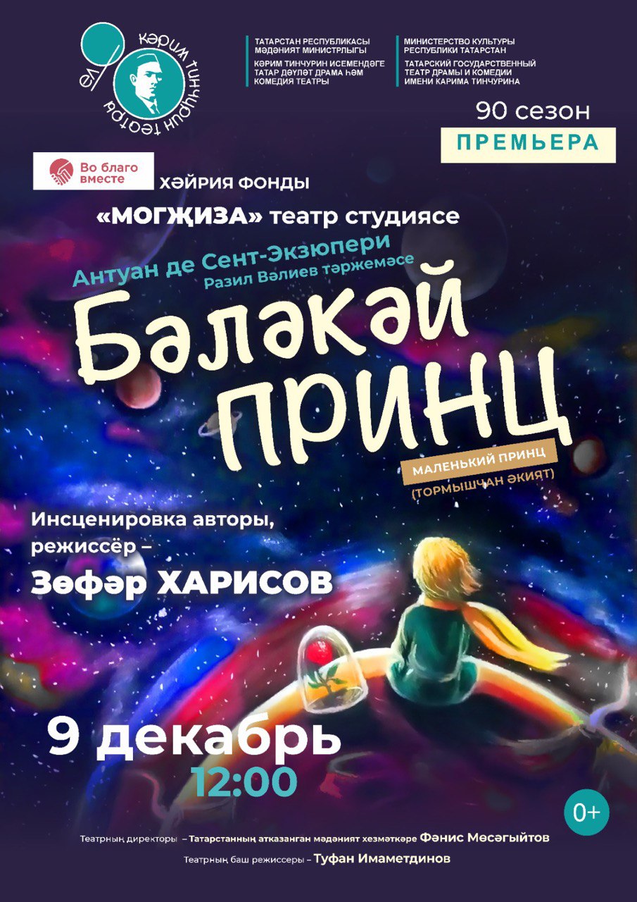 9 декабря в 12.00 в Татарском государственном театре драмы и комедии им. К.Тинчурина инклюзивная театральная студия «Чудо» («Могҗиза») представит жизненную сказку «Маленький принц» (0+). Автор – Антуан де Сент-Экзюпери, перевод Разиля Валиева. Режиссер и автор инсценировки – Зуфар Харисов.