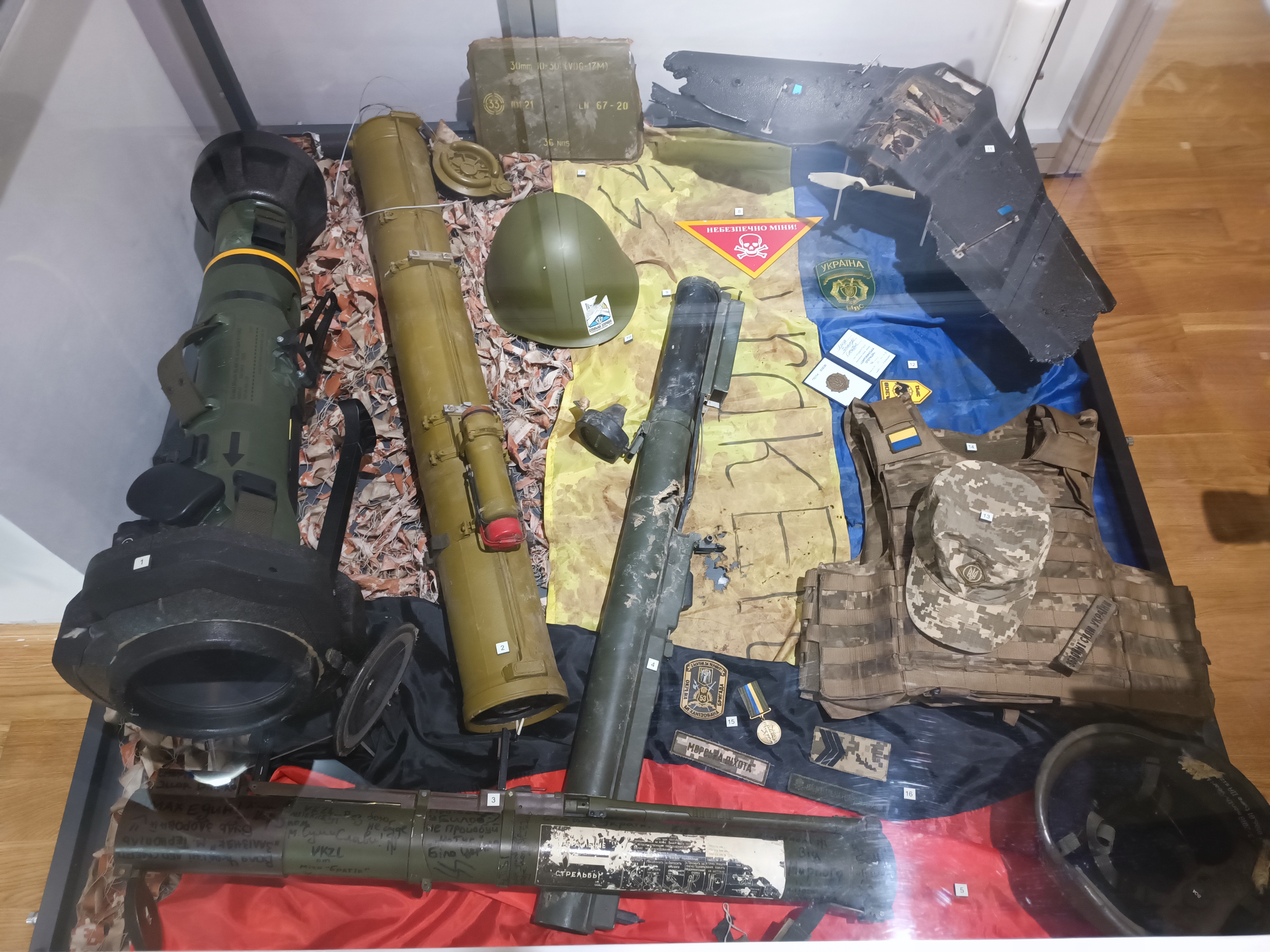 Роль Татарстана на Донбассе в современном мире отражают предметы, которые предоставили благотворительные организации, волонтерские и добровольческие отряды. Представлен полный комплект тактического снаряжения, аптечки и набор бандажей, которые делает благотворительная организация «Ценим жизнь». Шевроны добровольческого татарстанского отряда «Алга», индивидуальные рационы питания, окопные свечи, маскировочные сети – всё есть на выставке. На фотографиях показано участие республики в СВО – от фотографий бойцов до изготовления домашней лапши для отправки на фронт.