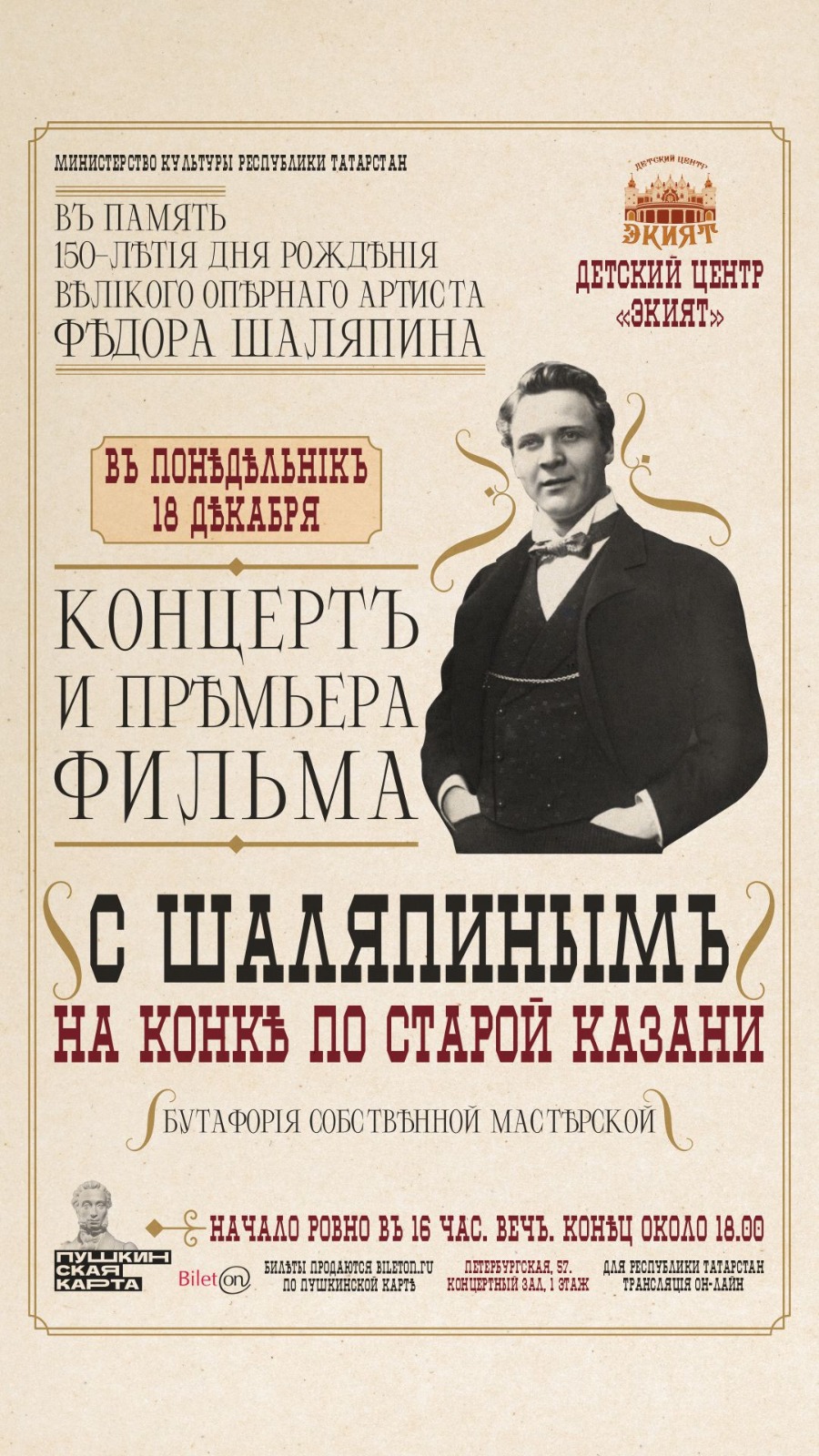 18 декабря в 16.00 в Детском центре «Экият» пройдет творческий вечер, посвященный 150-летию со дня рождения великого оперного певца Федора Ивановича Шаляпина «С Шаляпиным на конке по старой Казани».