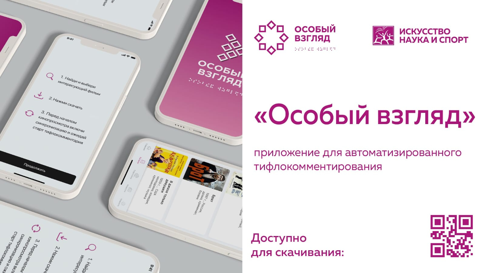 Приложение «Особый взгляд» разработано благотворительным фондом «Искусство, наука и спорт». Сервис позволяет слабовидящим и полностью незрячим людям смотреть фильмы с синхронизированным тифлокомментарием (пояснением, какой предмет находится на экране, описанием пространства), без которого незрячие люди не могут полноценно смотреть кинофильмы.