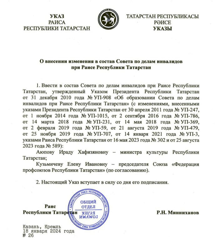 Министр культуры Республики Татарстан Ирада Аюпова вошла в состав Совета по делам инвалидов при Раисе Республики Татарстан. Изменения в Указ внесены сегодня и опубликованы на официальном портале Раиса Республики Татарстан.