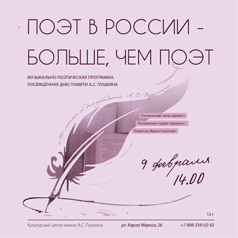 9 февраля в 14:00 в Культурном центре имени А.С.Пушкина пройдёт специальная литературно-музыкальная программа «Поэт в России - больше, чем поэт».
