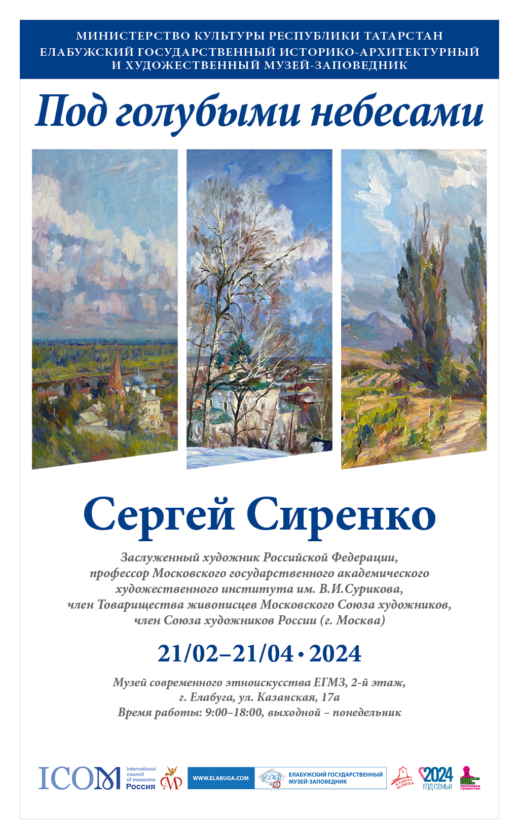 21 февраля в 15.00 в Музее современного этноискусства Елабужского государственного музея-заповедника состоится открытие выставки пейзажей заслуженного художника Российской Федерации, лауреата премии города Москвы, члена Товарищества живописцев Московского Союза художников, члена Союза художников России, профессора Московского Государственного академического художественного института имени В.И. Сурикова Сергея Сиренко «Под голубыми небесами» (г. Москва).