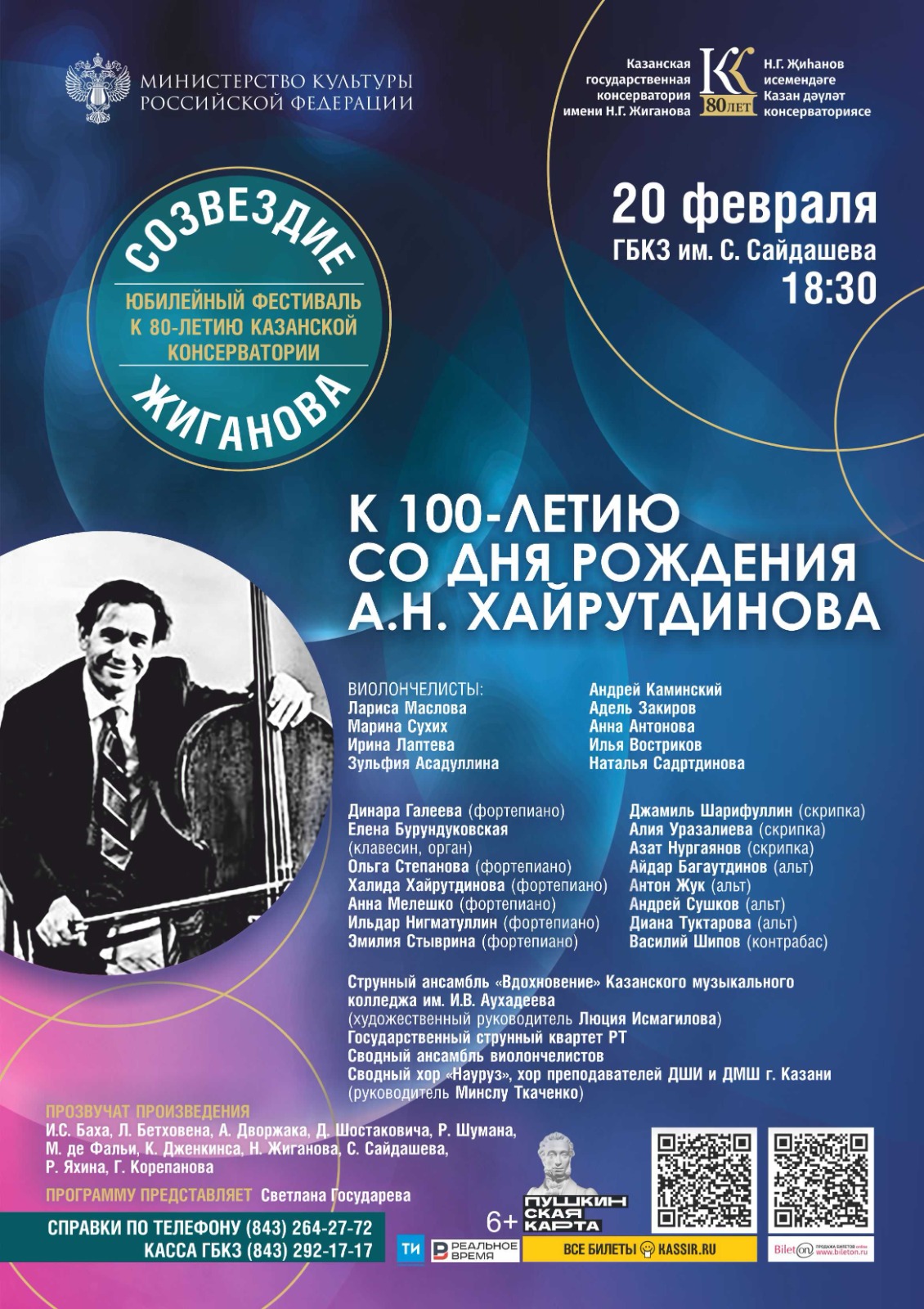 20 февраля в 18:30 в ГБКЗ им. С.Сайдашева пройдет концерт, посвященный 100-летию со дня рождения Афзала Насретдиновича Хайрутдинова – выдающегося виолончелиста Татарстана, профессора, кандидата искусствоведения, заслуженного деятеля искусств России и Республики Татарстан.