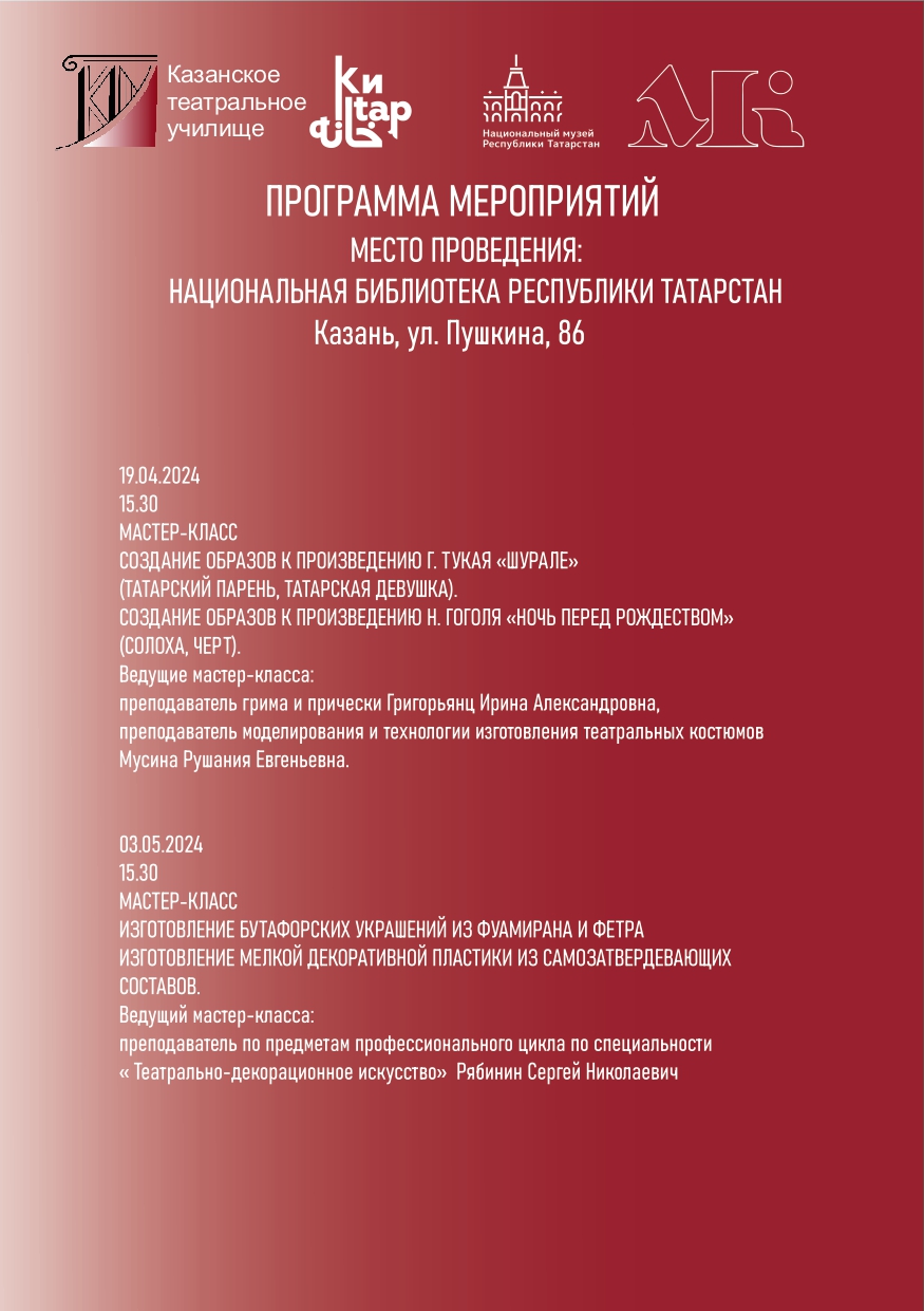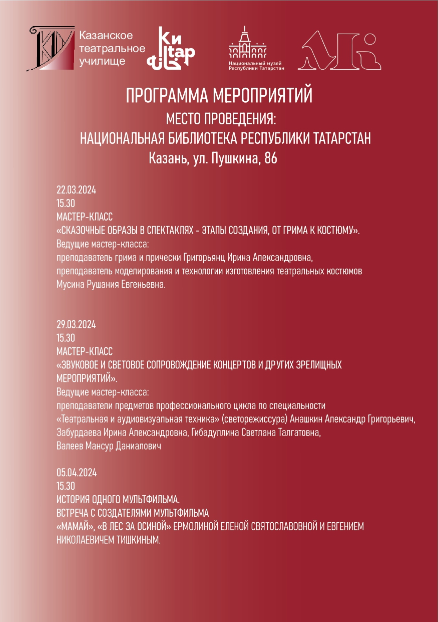 15 марта 2024 года в Выставочном зале Национальной библиотеки РТ в 15.30 состоится открытие выставки "Мир за сценой. Из прошлого в будущее". Выставка посвящена 60 - летию основания художественного направления в Казанском театральном училище.