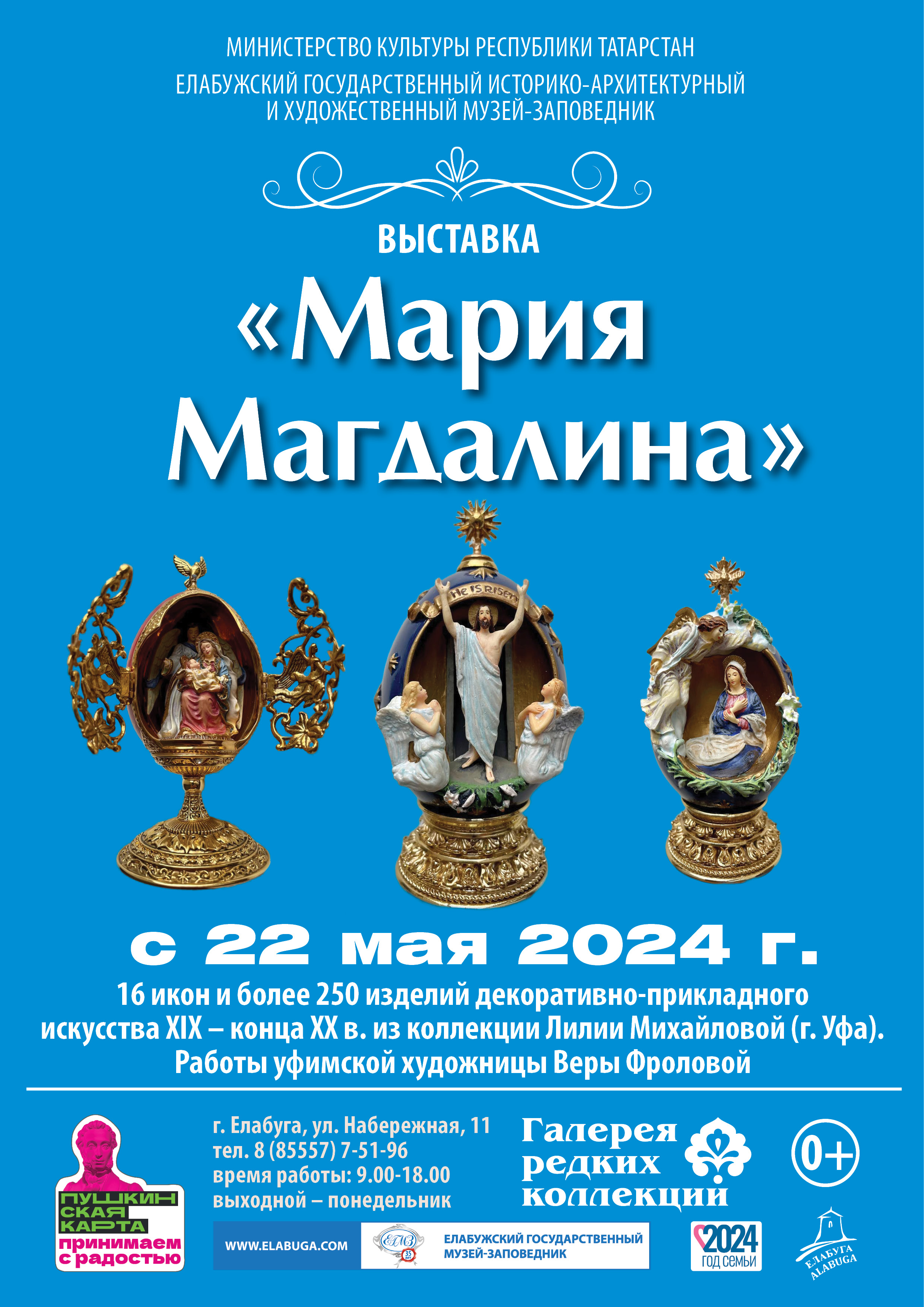 22 мая в 15 часов в Галерее редких коллекций Елабужского государственного музея-заповедника состоится открытие выставки «Мария Магдалина» из коллекции Лилии Михайловой (г. Уфа). Это 16 икон и более 250 изделий декоративно-прикладного искусства XIX – конца XX в. Дополнят экспозицию яркие и жизнеутверждающие работы уфимской художницы Веры Фроловой.