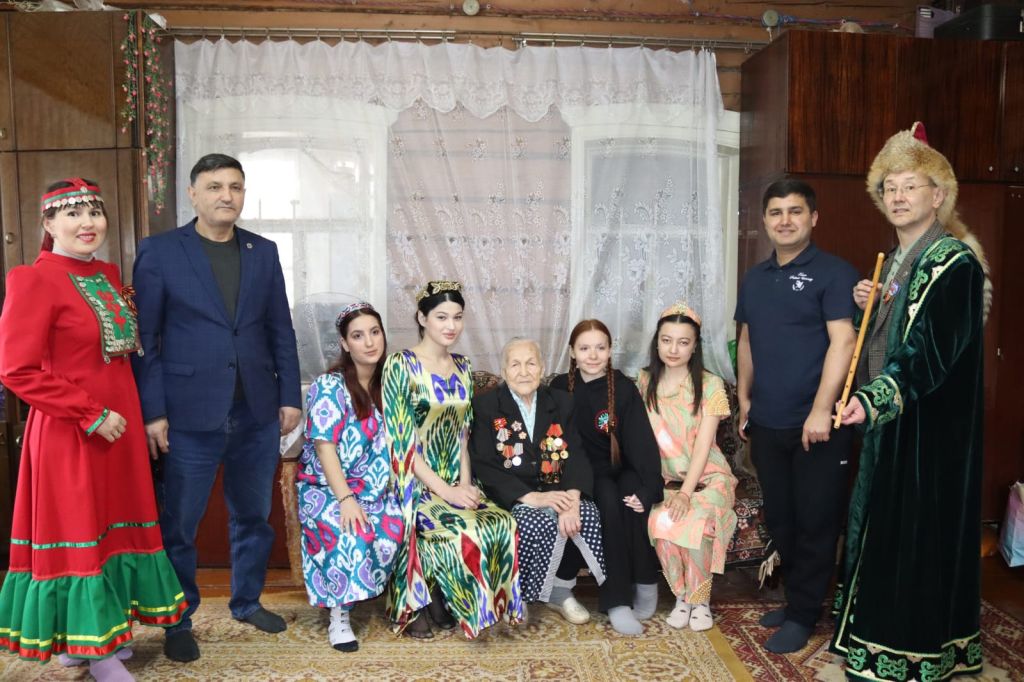 Ветерану Великой Отечественной войны Амине Гаязовне Ахмадеевой в июле этого года исполняется 101 год. При поддержке Дома Дружбы народов Татарстана поздравить её с 80-летием Победы приехал заместитель председателя национально-культурной автономии таджиков Татарстан Мирали Джонбеков и активисты молодёжного движения объединения. К акции присоединился зампредседателя НКА башкир РТ Тимур Юсупов вместе с молодежью объединения.