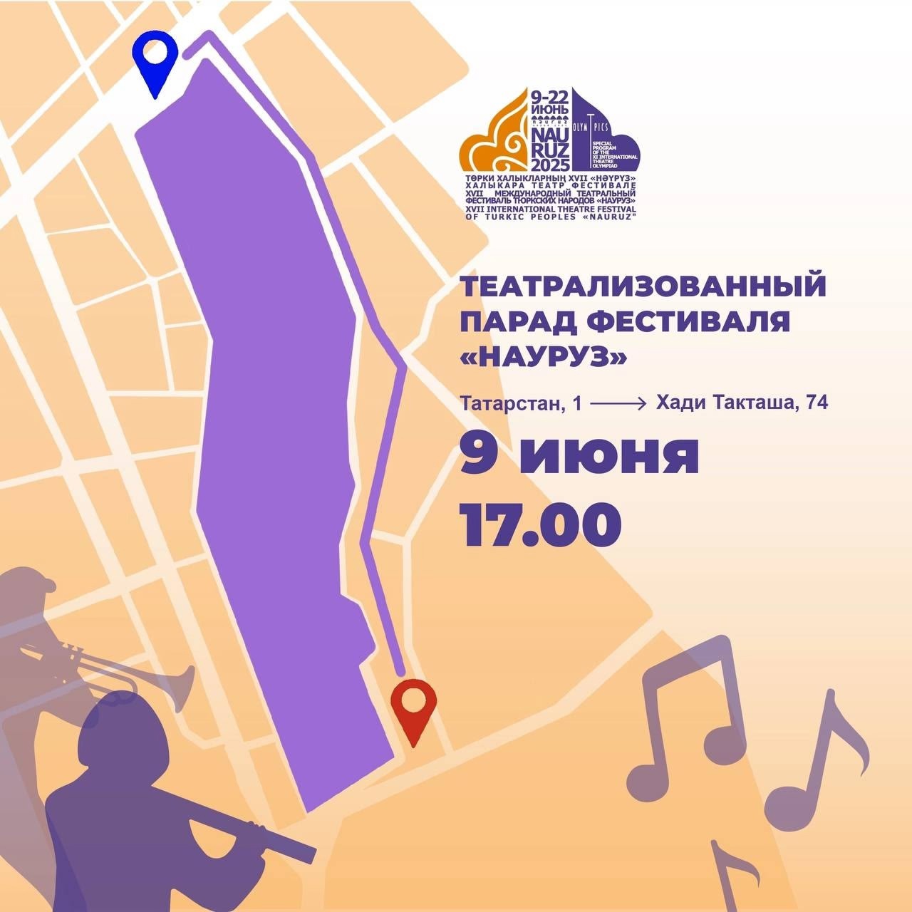 9 июня в 17:00 в честь открытия Международного театрального фестиваля «Науруз» состоится театрализованный парад участников фестиваля от исторического (Татарстан, 1) к новому зданию Татарского государственного Академического театра имени Г.Камала (Х.Такташа, 74).