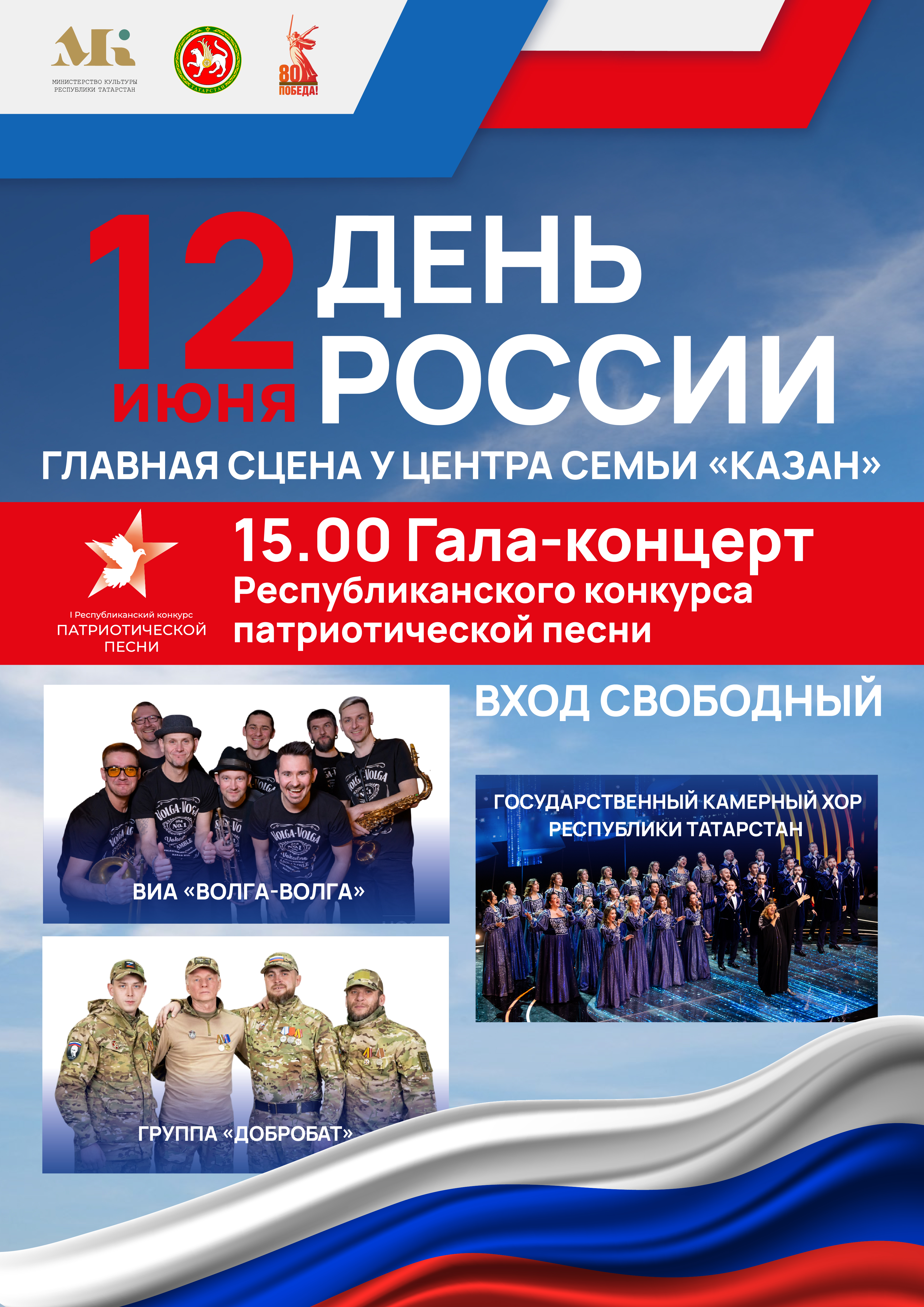 В День России в 15:00 на сцене около Центра семьи «Казан» пройдет гала-концерт I Республиканского конкурса патриотической песни, проведенного Министерством культуры Республики Татарстан.