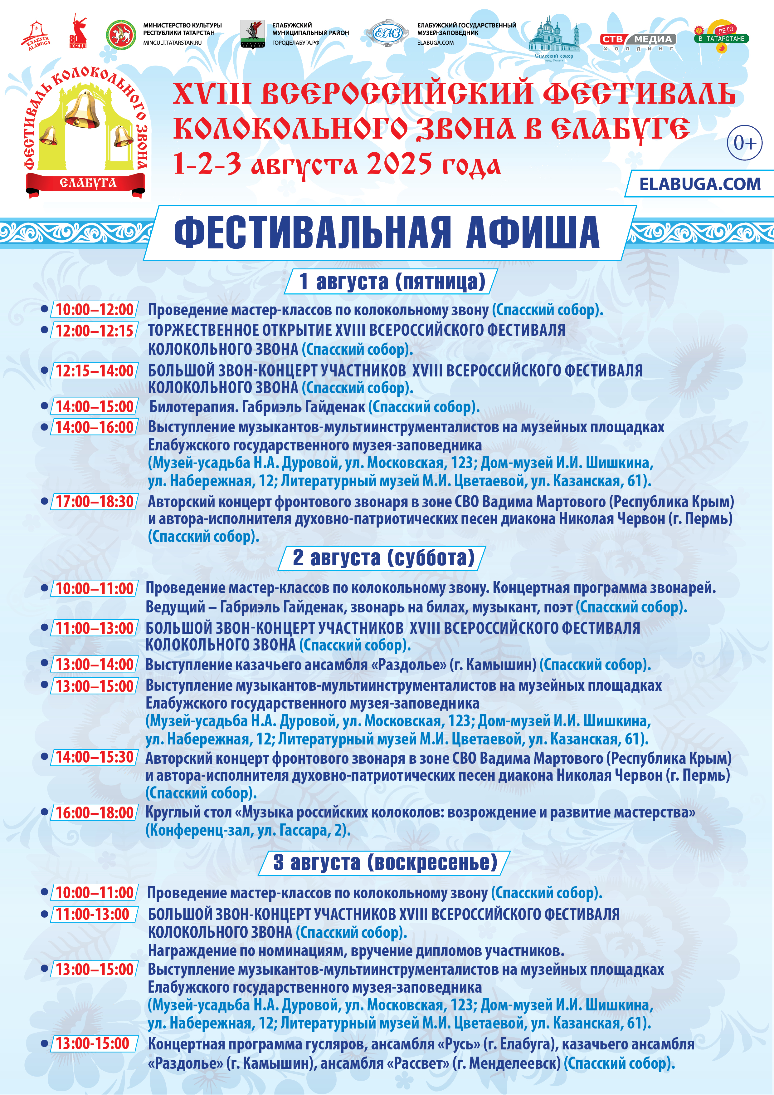 1, 2 и 3 августа 2025 г. Елабужский государственный музей-заповедник организует и проводит XVIII Всероссийский фестиваль колокольного звона в Елабуге.
