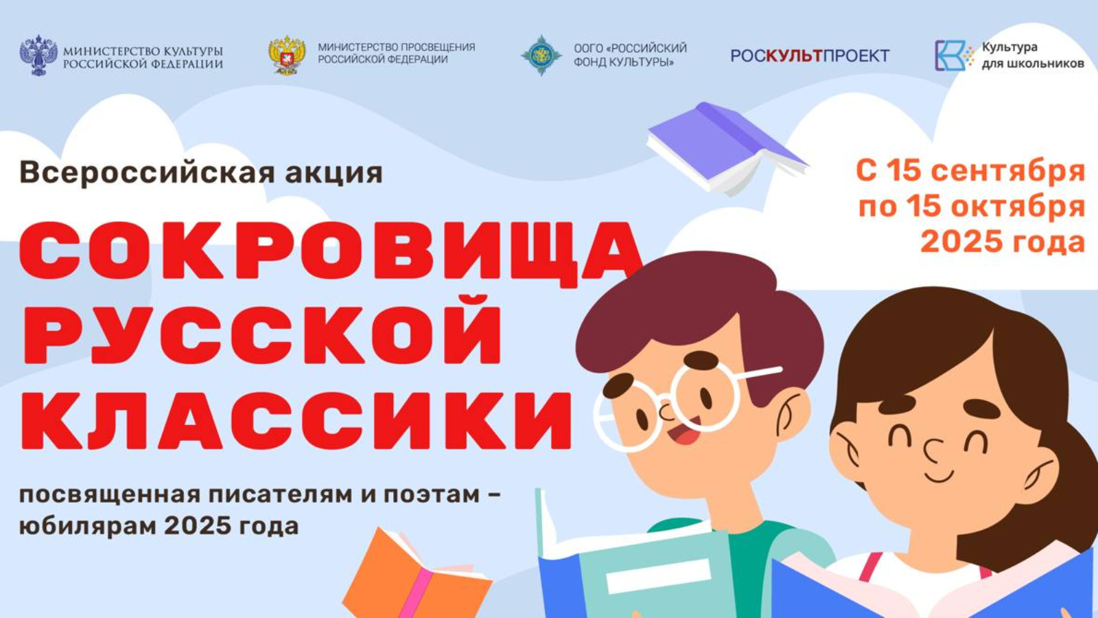 Уже совсем скоро, 15 сентября, начнётся грандиозная всероссийская литературная акция «Сокровища русской классики». Этот масштабный проект позволит школьникам всей страны окунуться в мир творчества наших великих авторов, чьё творчество отмечают в юбилейном 2025-м.