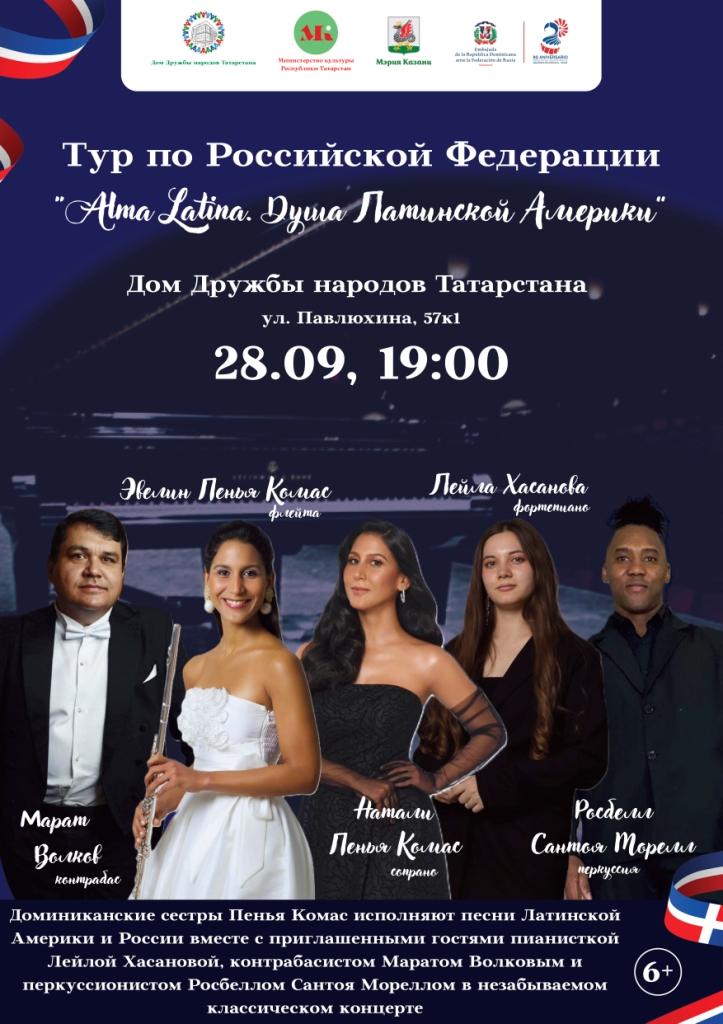 28 сентября в Доме Дружбы народов Татарстана состоится концерт «Alma Latina. Душа Латинской Америки» по случаю 181-й годовщины национальной независимости Доминиканской Республики и 80-й годовщины установления дипломатических отношений между Доминиканской Республикой и Российской Федерацией.
