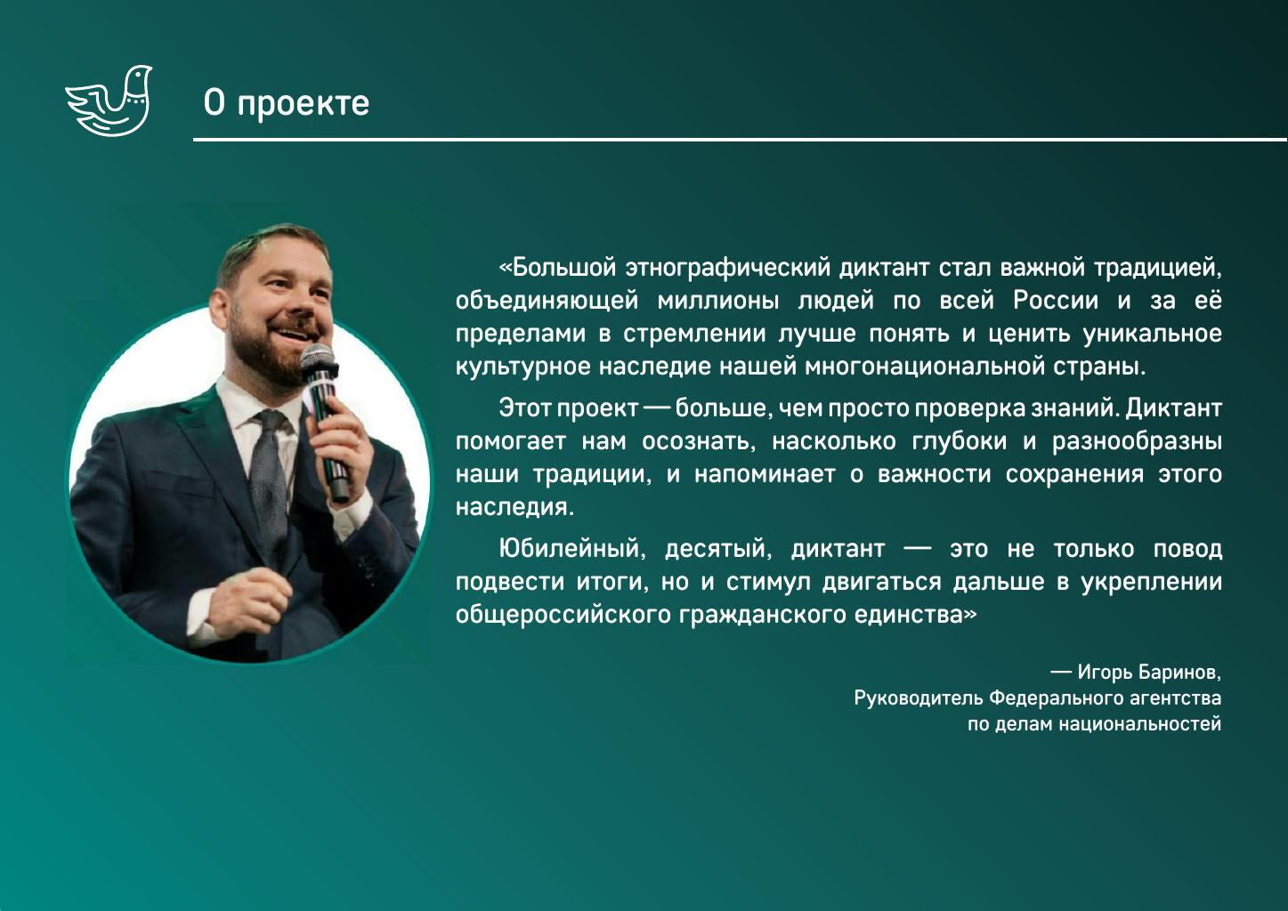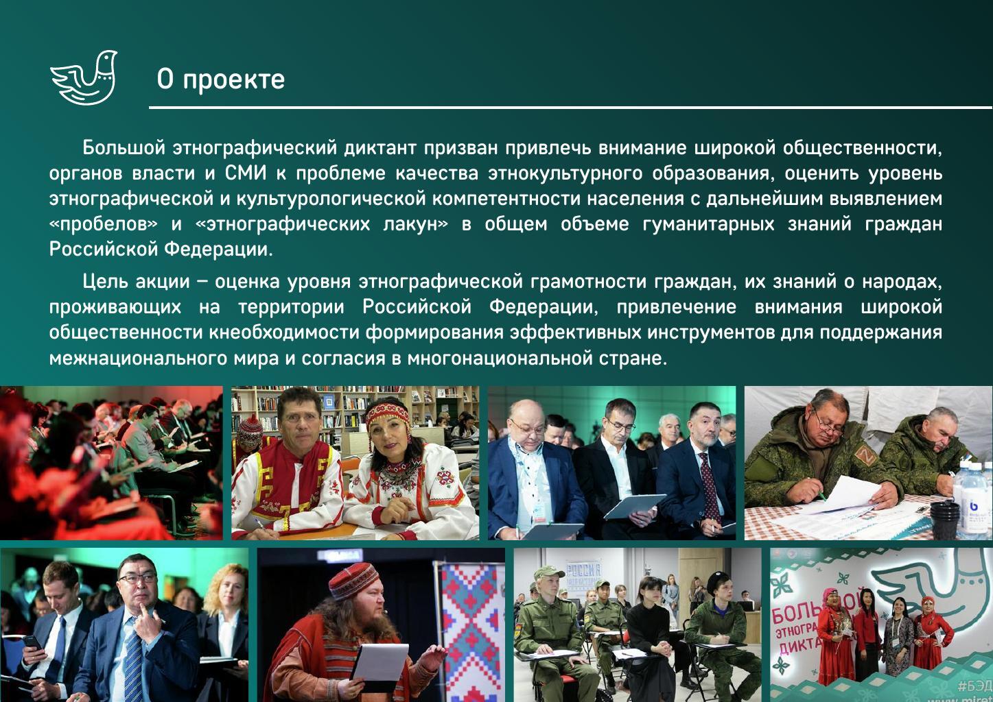 С 1 по 8 ноября 2025 года Федеральное агентство по делам национальностей совместно с партнёрами проводит X Всероссийскую просветительскую акцию «Большой этнографический диктант». Юбилейная, десятая по счёту акция направлена на укрепление общероссийской гражданской идентичности, популяризацию традиционных российских духовно-нравственных ценностей и борьбу с фальсификацией истории.