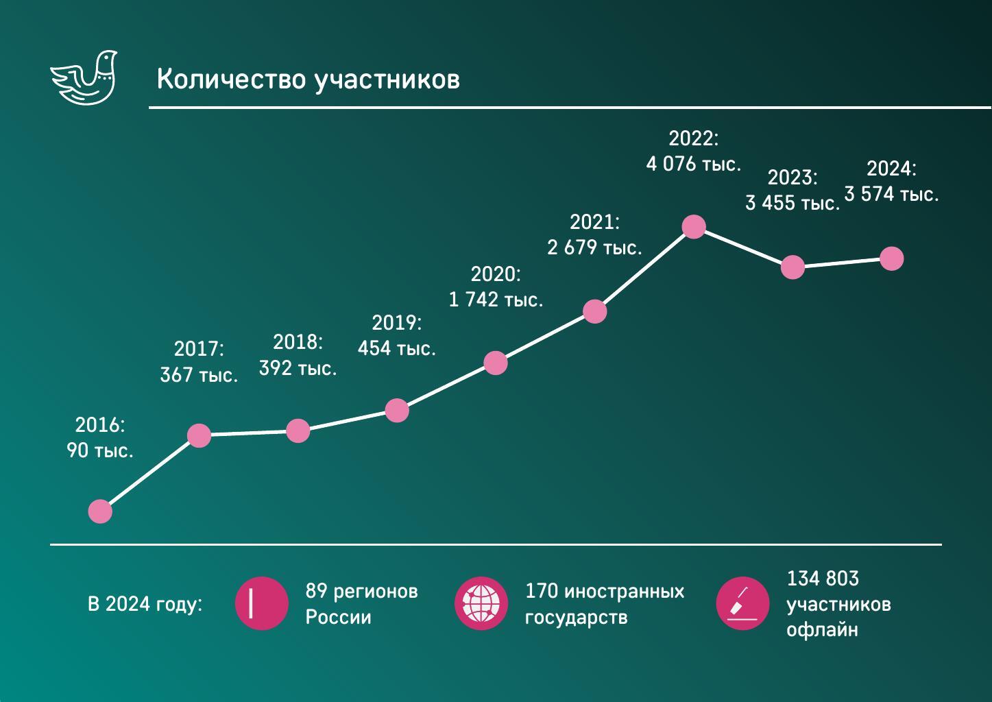 Участие в диктанте объединяет людей разных возрастов, профессий и национальностей, подчеркивая ценность культурного многообразия и единства России.