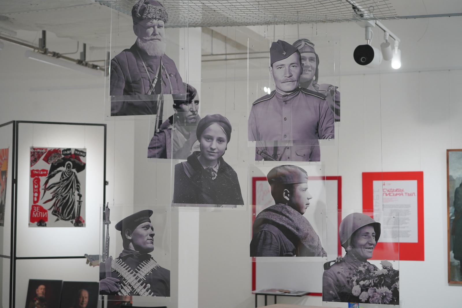 Особую пронзительность экспозиции придает масштабная инсталляция, составленная из фотодокументов военных лет, которая занимает центральное место в зале. Лица солдат, тружеников тыла, матерей и детей позволяют зрителю ощутить всю тяжесть и надрывность пути к Победе.