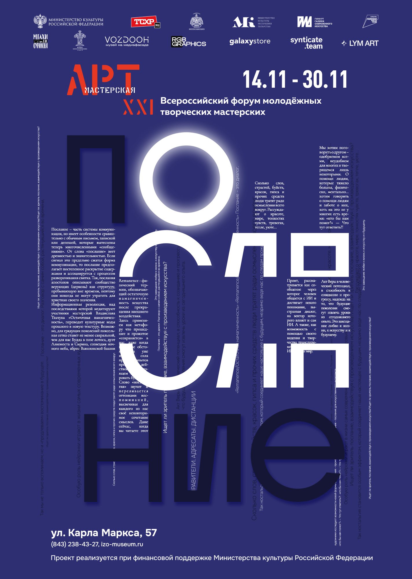 13 ноября в 16:00 в Галерее современного искусства ГМИИ РТ «Послание» в рамках VII Всероссийского форума молодёжных творческих мастерских «АРТ-Мастерская XXI». Форум организован Творческим союзом художников России при финансовой поддержке Министерства культуры РФ. 83 работы участников в формате живописи и мультимедийного искусства раскрывают тему «Послание» – невербальное послание, которое выносят художники в ответ на проблематику окружающей действительности. Вход на вернисаж свободный с 16:00 до 17:00.