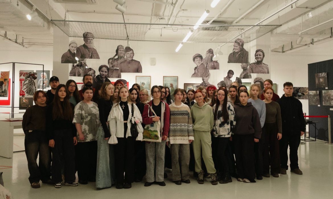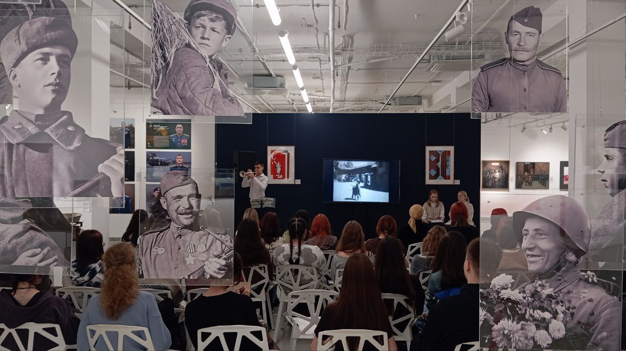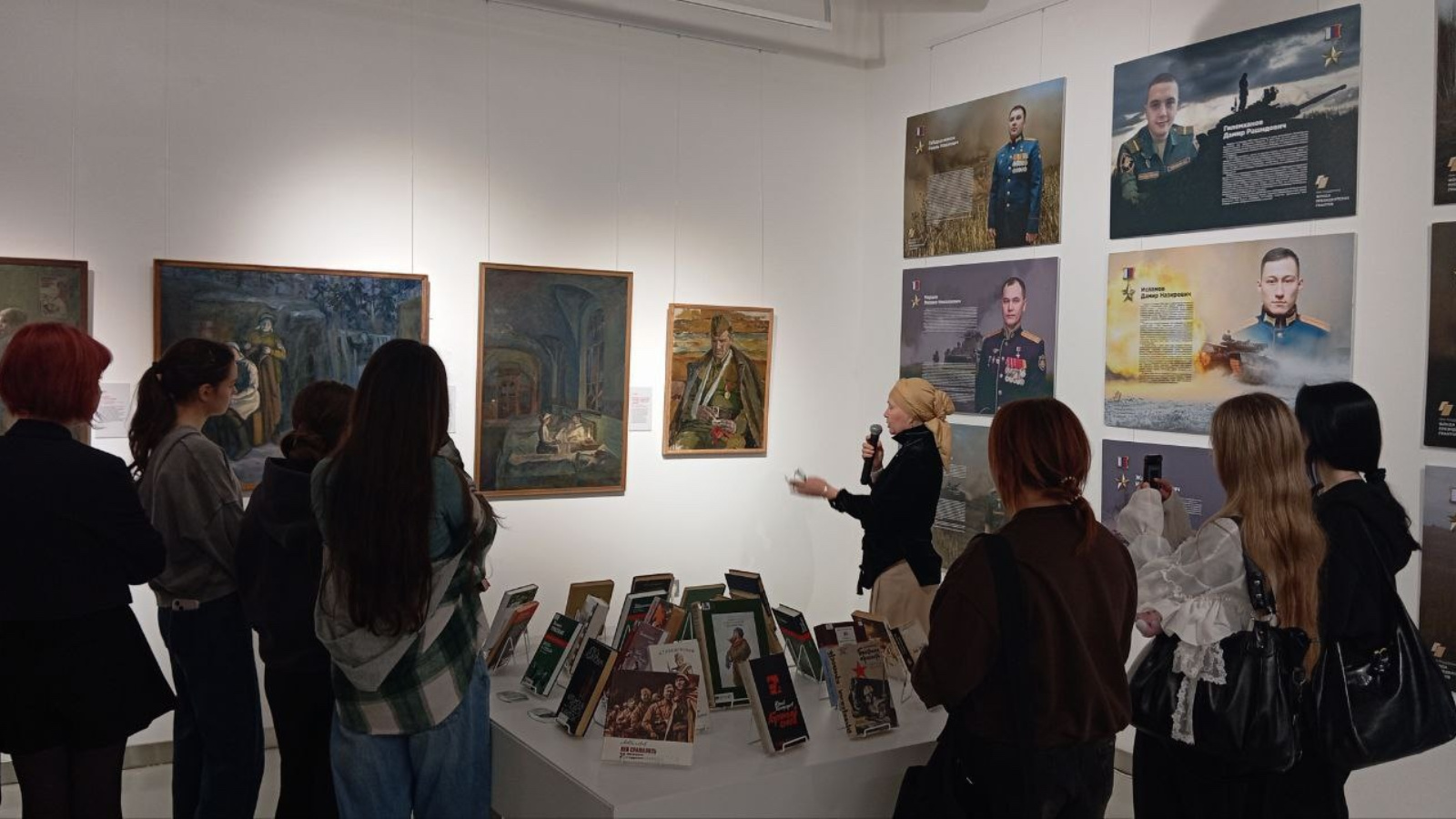 Заместитель директора художественного училища Д.Х. Камалова провела для участников встречи замечательную обзорную экскурсию по экспозиции "Путь к Победе". Она подчеркнула, что выставка визуально связывает подвиги защитников Отечества всех поколений: экспозиция соединяет героические страницы Великой Отечественной войны с подвигами наших современников в зоне СВО и сотрудников ОВД, погибших при исполнении служебных обязанностей, напоминая, что подвиг защитника не имеет срока давности.